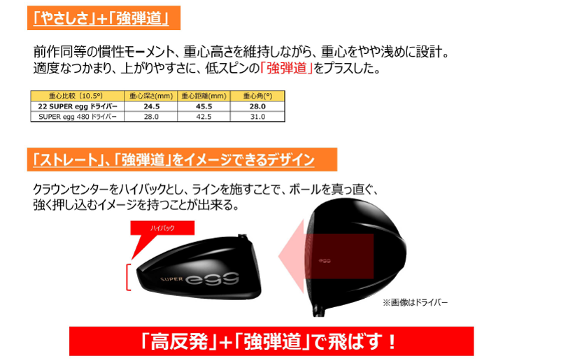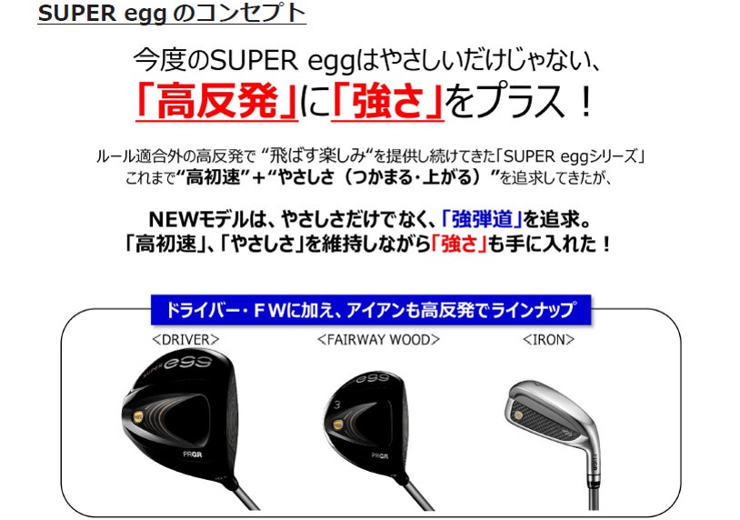 プロギアは、やさしさと「高反発」だけでなく「強弾道」でさらに飛ばす「SUPER eggドライバー」、「高反発」と「高弾道」でグリーンを狙う「SUPER eggアイアン」も同時発売します。