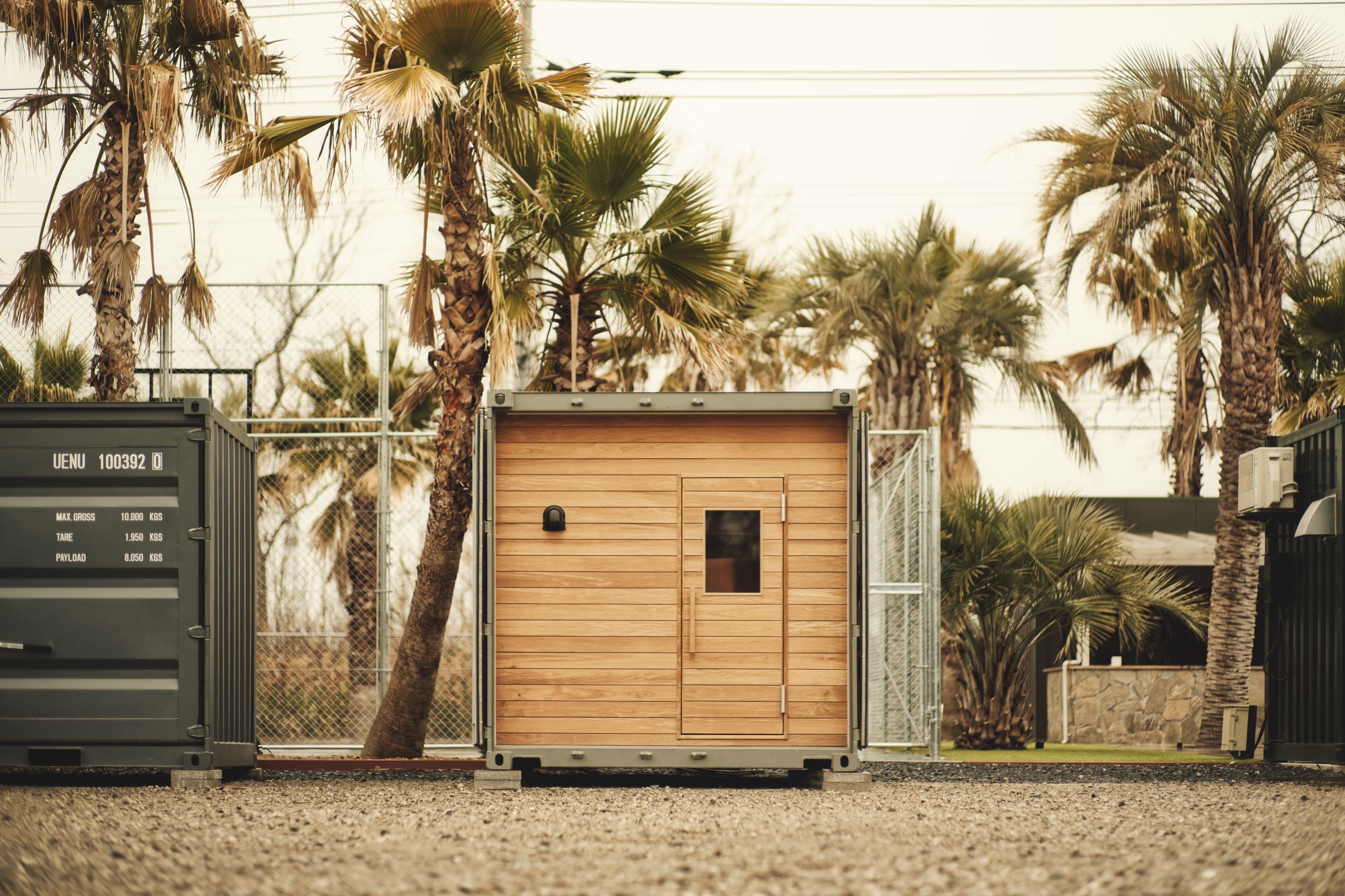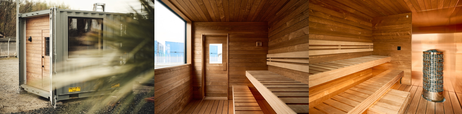 海上コンテナの重厚な扉を開くと、コンテナのスチールの質感とは違ったサウナ室内と同じ木の外壁と扉がサウナ室の入り口となります。外壁材と扉には、SAUNA BLOCKのために直輸入した特注のアスペン材が使われています。