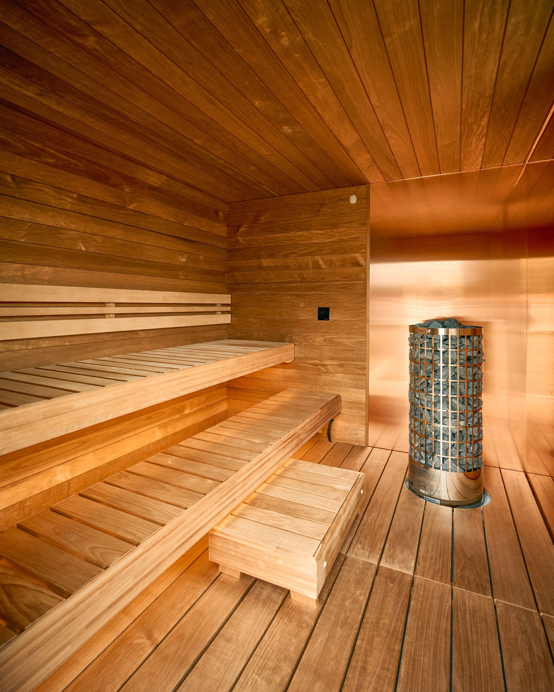海外でサーモ処理を施したこのアスペン材は、サウナ室内においてもふんだんに使われています。壁面全面の他、床、天井、窓枠、扉、引手のすべてに仕上げ材として使用。これにより、国産の木材では味わえない風合いを醸し出すと同時に、アスペン材特有のリラック効果と上品さを併せ持つ木の匂いを感じられる特別な空間を、10Ftのサウナ室内に作り出します。