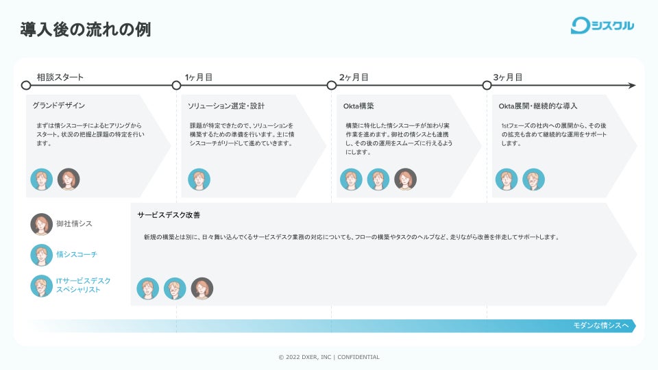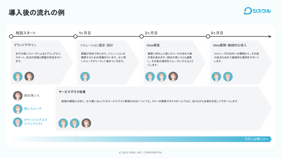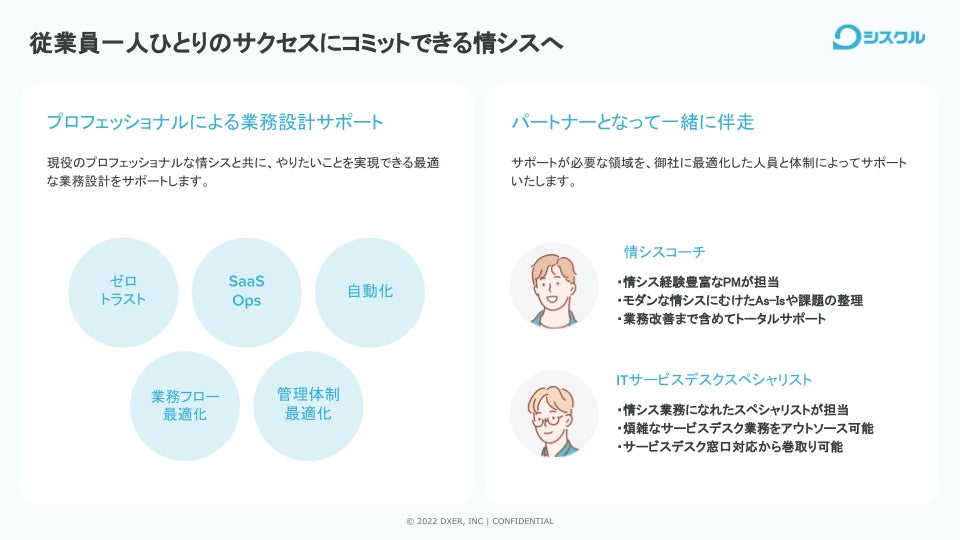 その過程で、幅広い情シス課題を解決するためには人員補充としての専門人材のシェアリングだけでなく、情シスチームの抜本的な変革の必要性を実感するようになり、本サービスを モダンな情シスに変革させる伴走型支援サービス「シスクル」としてリニューアルいたしました。