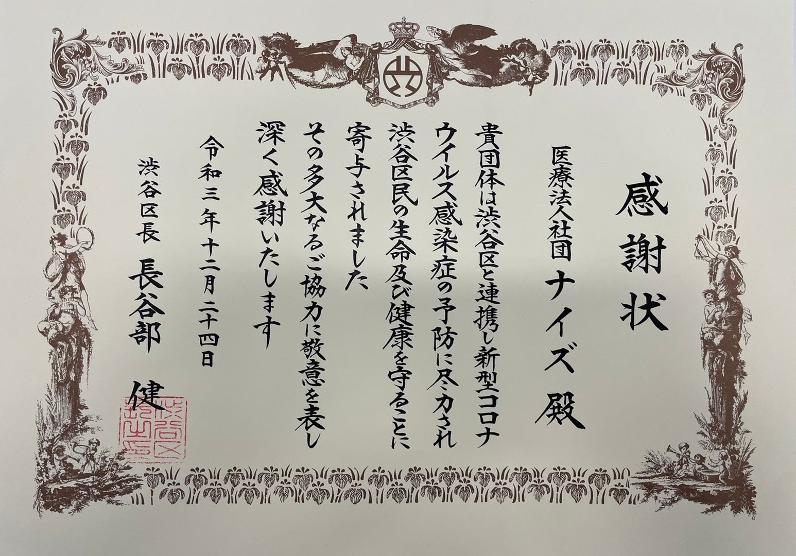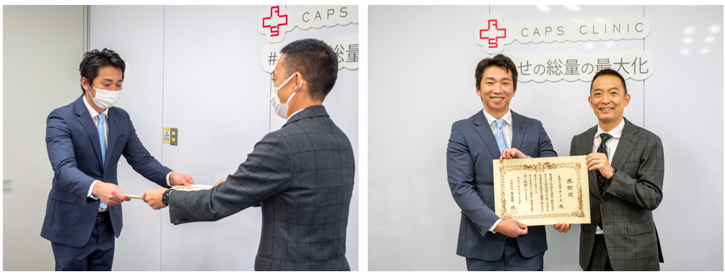 首都圏を中心に365日年中無休の「キャップスクリニック」を展開する医療法人社団ナイズ(東京都渋谷区、理事長:白岡亮平、以下「CAPSグループ」)は2021年12月24日(金)に、渋谷区の長谷部健区長より、渋谷区の集団接種会場での新型コロナワクチン提供など、渋谷区民への新型コロナウイルス感染予防に尽力したことを評価いただき、感謝状を贈呈いただきました。