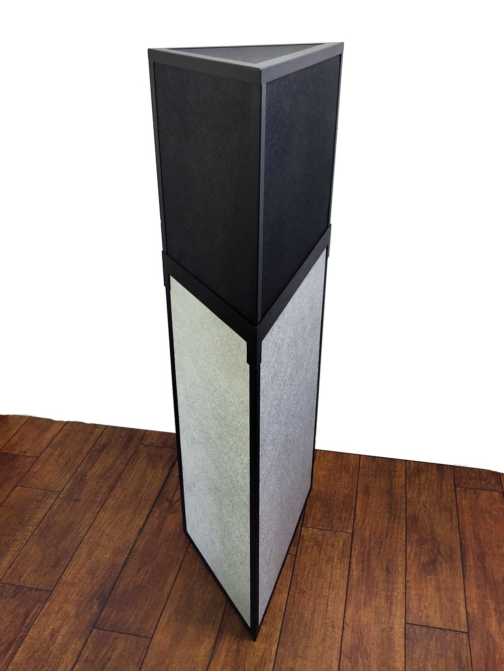三角錐の形状で全面吸音面のため、部屋の隅やスピーカー中央に配置可能です。『SHIZUKA Stillness Panel SDM』と組み合わせることで広範囲の吸音性能を発揮します。高さ調整可能
