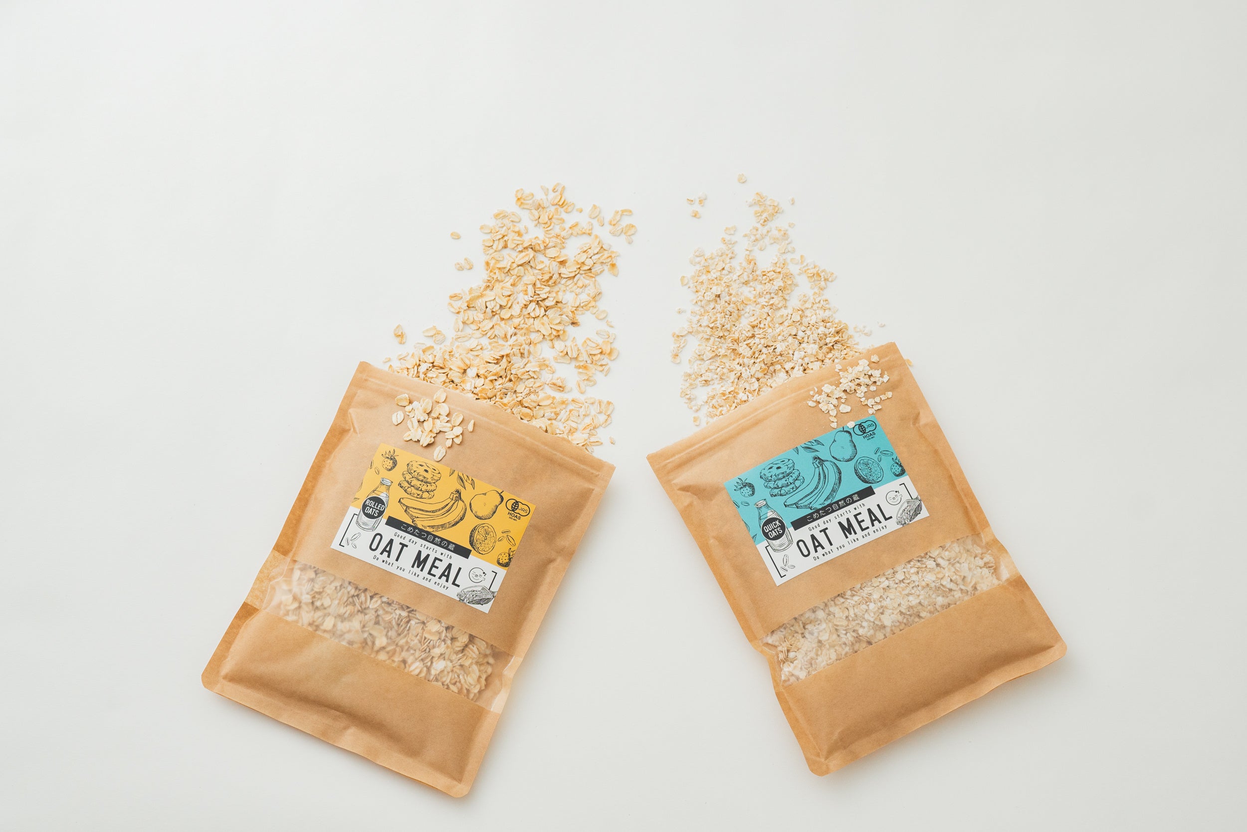 オートミールは「ロールドオーツ」と「クイックオーツ」の2種類からお好みを選べます。2つのオートミールの違いは粒の細かさ。ロールドオーツを細かく砕いたものがクイックオーツです。