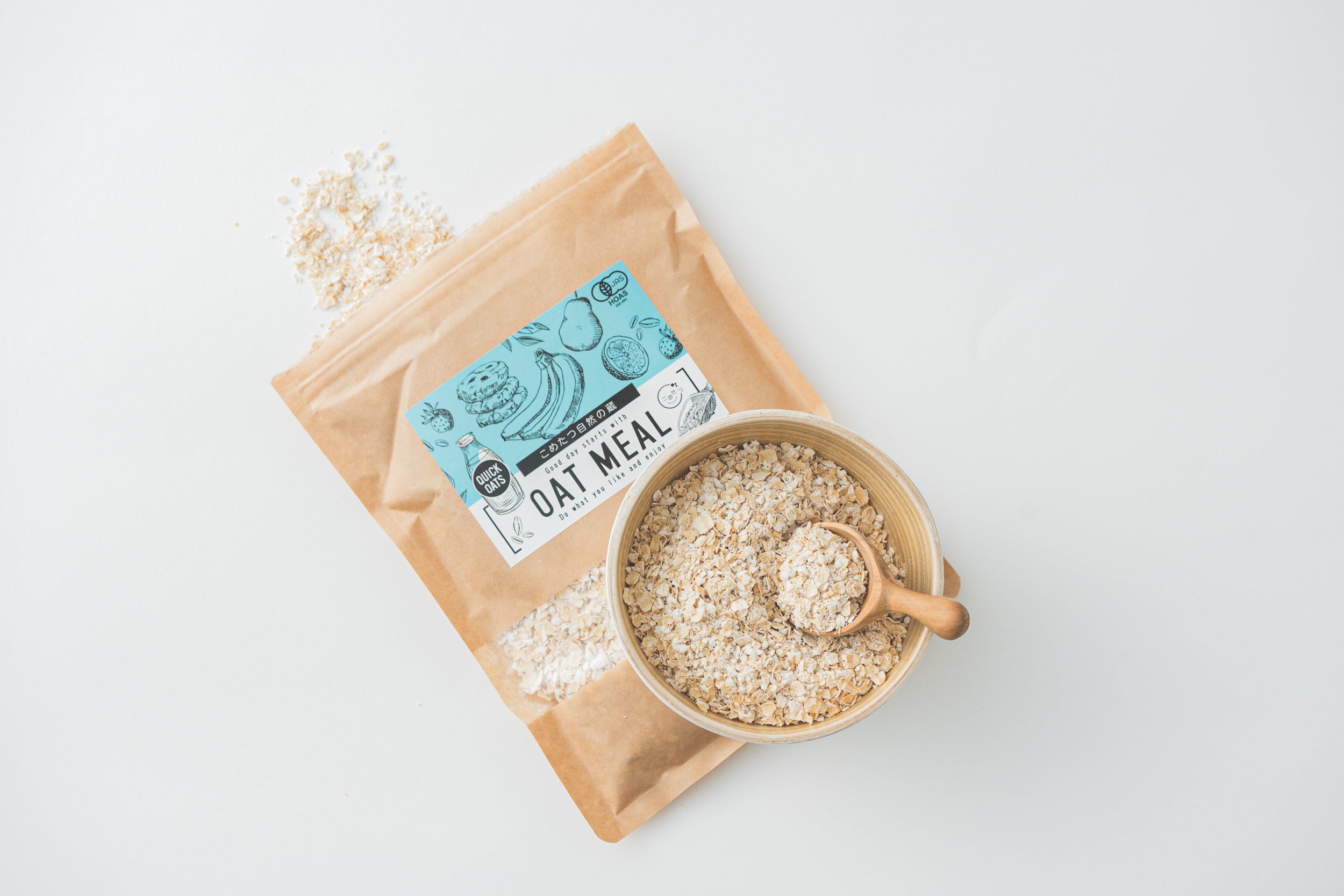 こめたつのオートミールは、日本で有機JIS認定されたものを使用しています。また、化学肥料・化学農薬不使用、添加物も不使用で、安心安全の有機オーツ麦100%です。