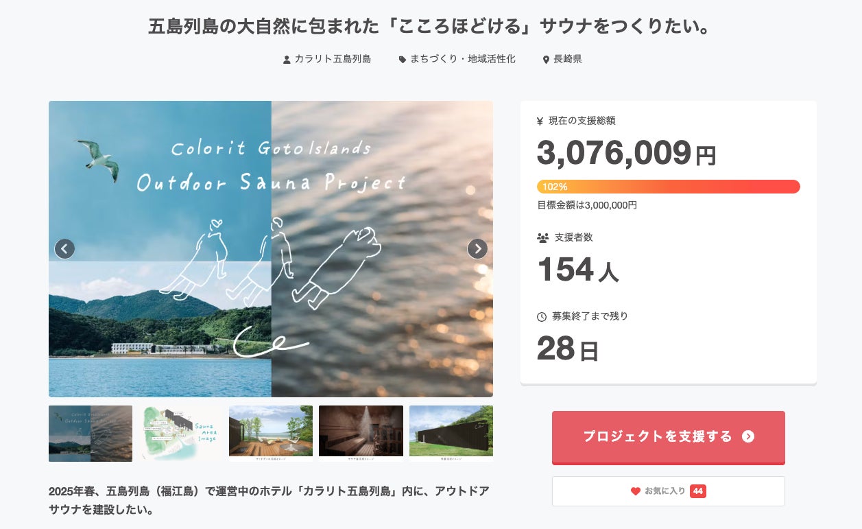 カラリト五島列島、「こころほどける」アウトドアサウナプロジェクト、クラウドファンディング開始後2週間で目標達成!