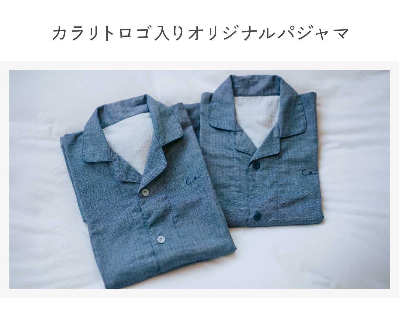 ダブルコットンとデニム生地を合わせてつくった、やわらかい肌触りに包まれるカラリトのロゴ入りオリジナルパジャマです。宿泊者からも大好評のパジャマをお家でもお楽しみいただけるようご用意しました。