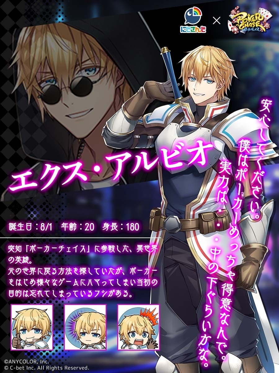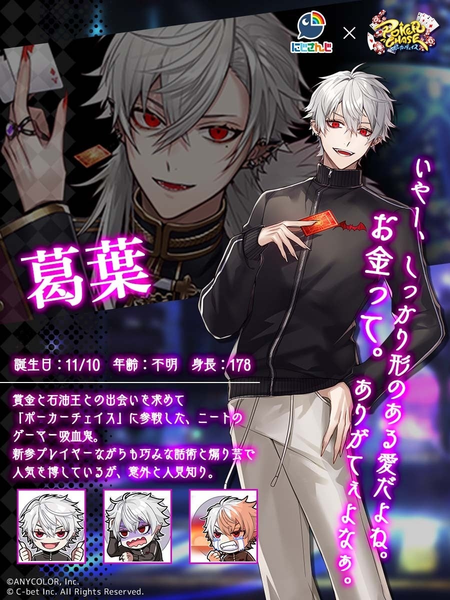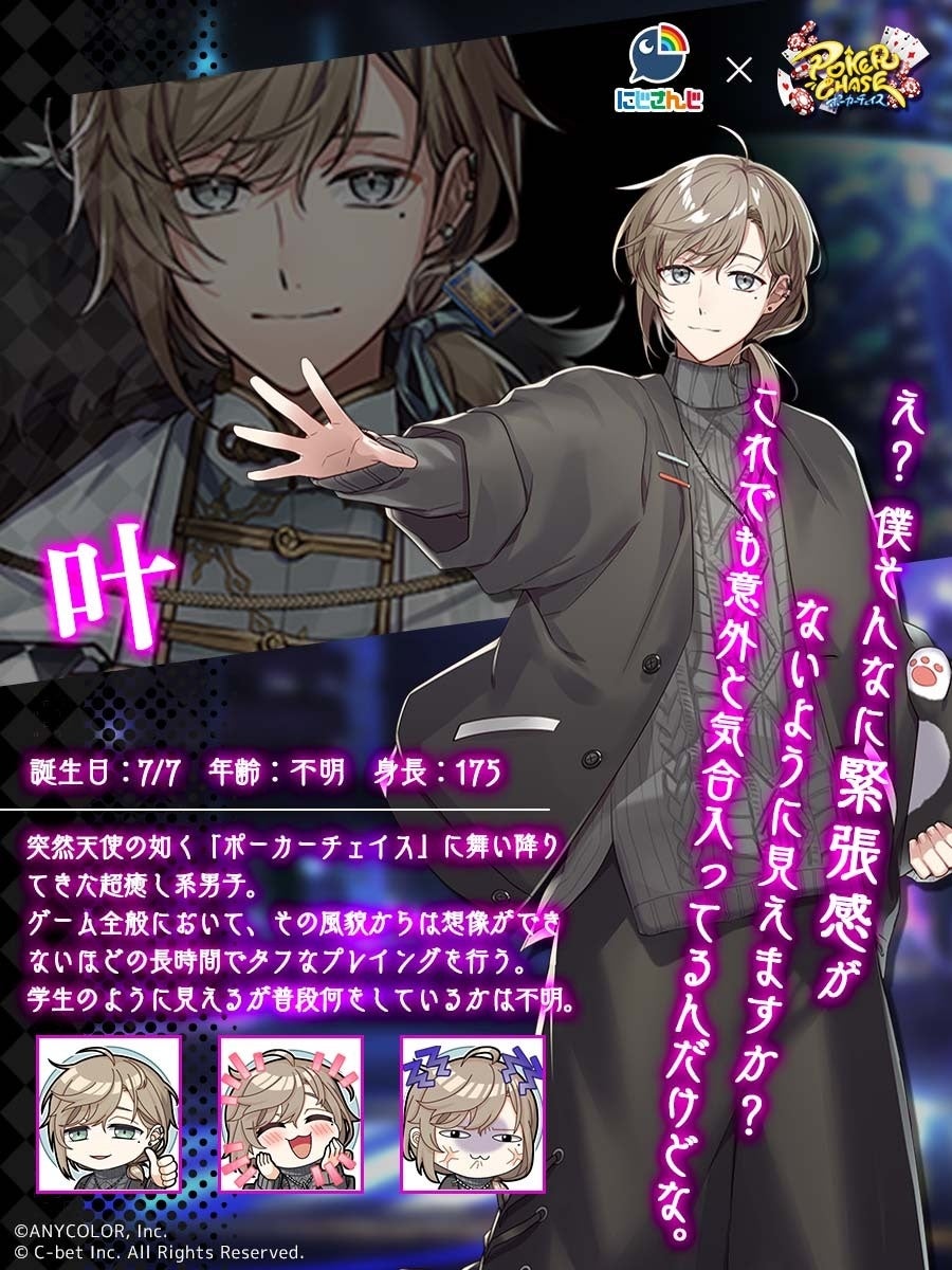 総勢40名以上の「にじさんじ」ライバーが参加したポーカー大会「NNOP2022」を主催した「エクス・アルビオ」さん、「叶」さんに加え、過去に配信したタイアップ番組にご出演いただいた「葛葉」さんの3名が『ポーカーチェイス』内のプレイアブルキャラとして期間限定で実装されます。