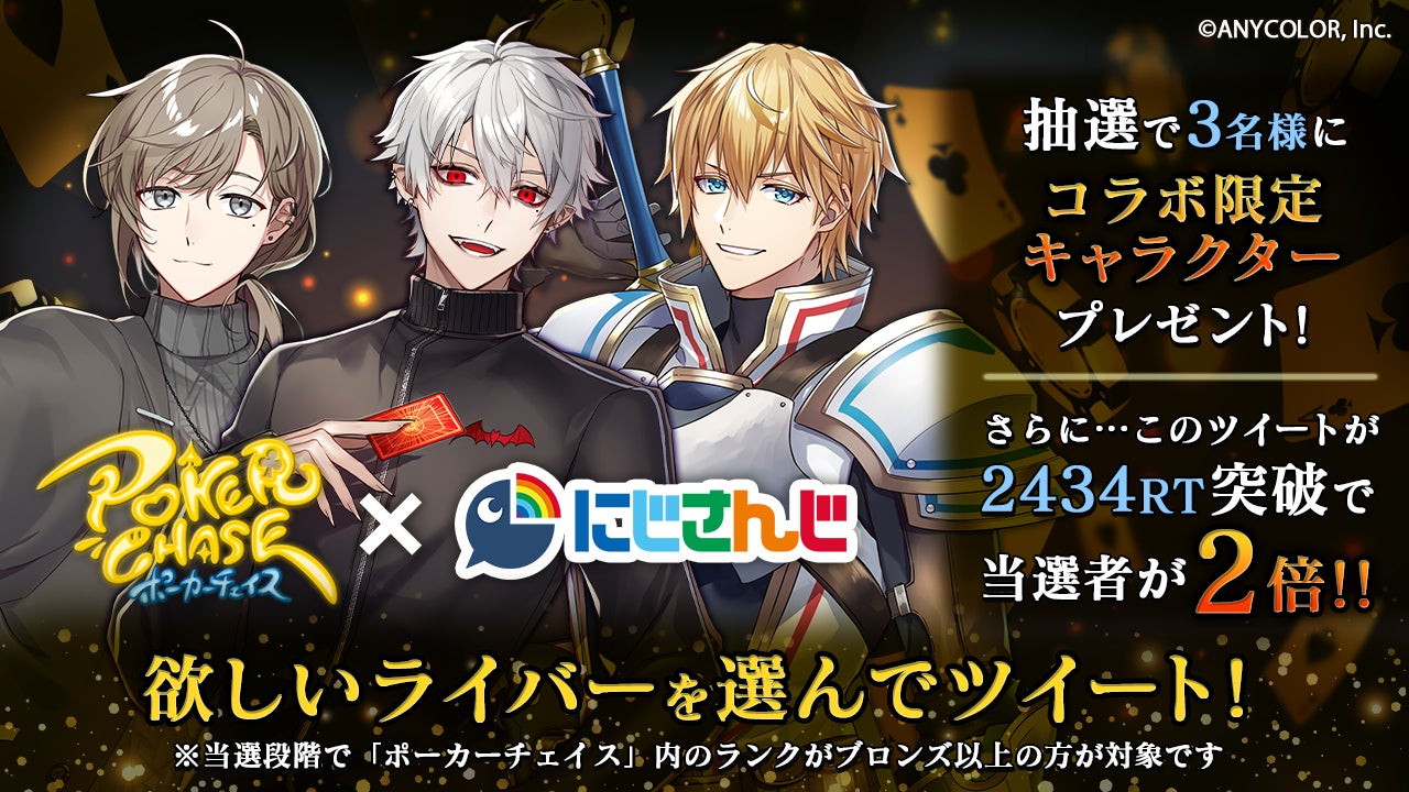 株式会社C-bet(東京都渋谷区、代表:田谷野 貴正、https://c-bet.co.jp/)は、バトロワ式オンラインポーカーゲーム『ポーカーチェイス』と人気バーチャルライバーグループ「にじさんじ」とのコラボイベントが開催決定いたしましたことをお知らせします。