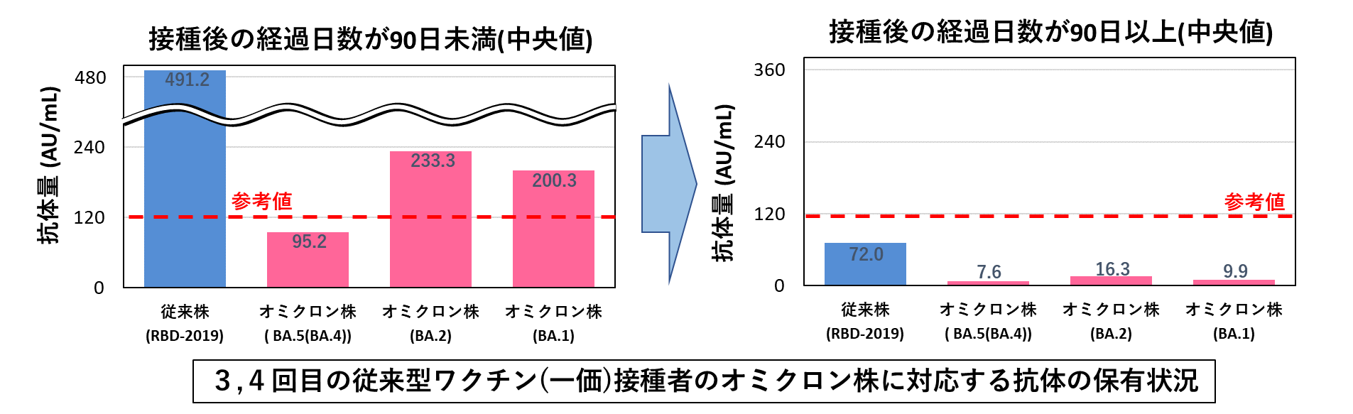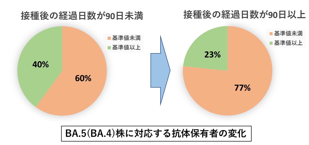 3、4回目の従来型ワクチン(一価)接種のみにおいて、オミクロンBA.5(BA.4)株に対する抗体の抗体量(抗体価)が参考値未満になる方の割合が、ワクチン接種後90日未満でも60%と高い値を示しました。さらに、その割合が、接種後90日以上経過した方では77%へと増加しました。