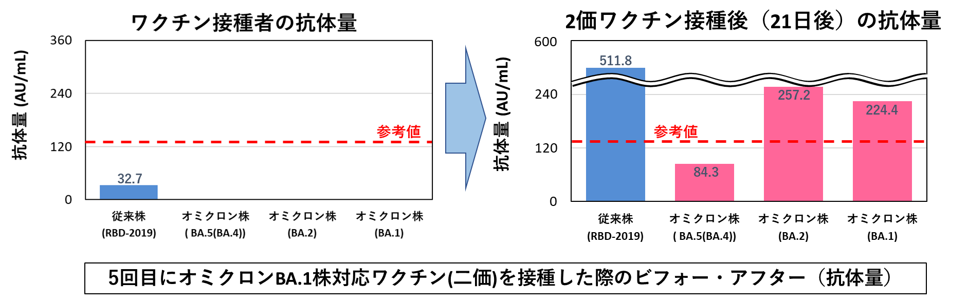 追加でワクチン接種をした場合に関して、以下の検証を行っております。3回目従来株ワクチン(一価)を8ヵ月前に接種した方について、オミクロンBA.1株対応ワクチン(二価)を接種した際のビフォー・アフターを確認したところ、抗体量(抗体価)が増加したことを認めました。