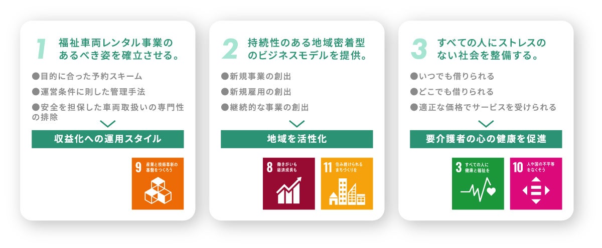 当社は、この福祉車両専門レンタカー事業を通して実現すべき3つのミッションを掲げています。
