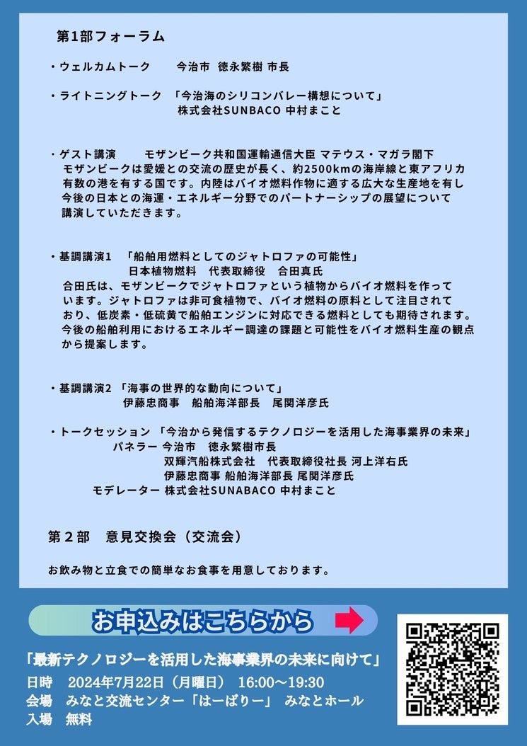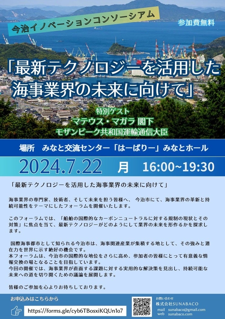 海事業界の専門家、技術者、そして未来を担う皆様へ、今治市にて、海事業界の革新と持可能性をテーマにしたフォーラムを開催いたします。このフォーラムでは、「船舶の国際的なカーボンニュートラルに対する規制の現状とその対策」に焦点を当て、最新テクノロジーがどのようにして業界の未来を形作るかを探求します。国際海事都市として知られる今治市は、海事関連産業が集積する地として、その強みと潜在力を世界に示す絶好の機会です。本フォーラムは、今治市の国際的な地位をさらに高め、参加者の皆様にとって有意義な情報交換の場となることを目指しています。今回の開催では、海事業界が直面する課題に対する実用的な解決策を見出し、持続可能な未来への道を切り開くための議論を展開します。皆様のご参加を心よりお待ちしております。