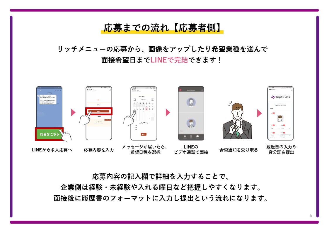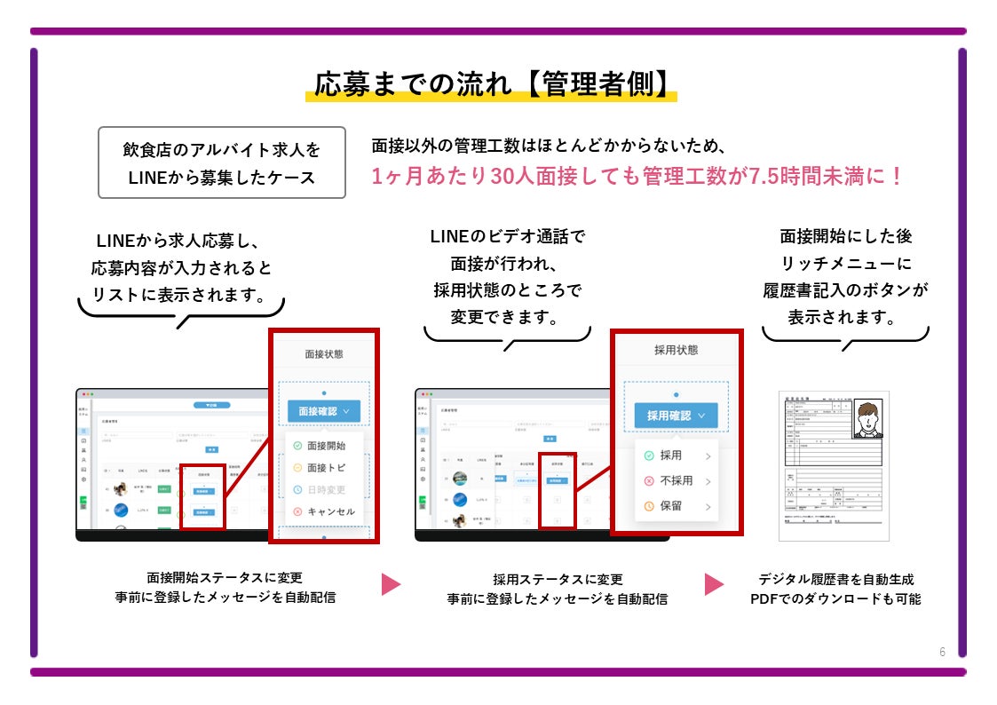 店舗管理者側の手間も徹底的に軽減。たとえば、月30名の面接を行う場合、従来は1人あたり30分程度かかっていた日程調整・履歴書チェックなどの作業が、ナイトリンクでは月合計7.5時間以下に削減可能です(※当社調べ)。