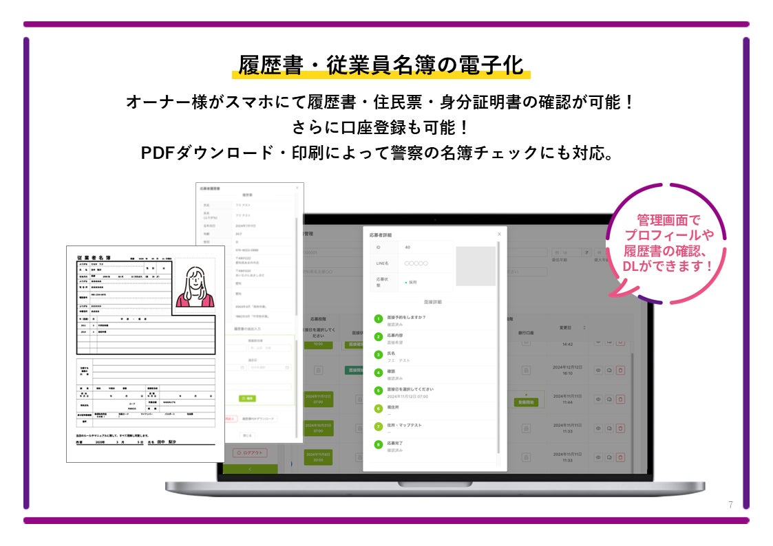 ナイトリンクでは、面接後に自動生成される履歴書情報や、提出された身分証・住民票データをPDFで一括管理・出力できるため、風営法に則った名簿作成・保存が簡単かつ確実に行えます。