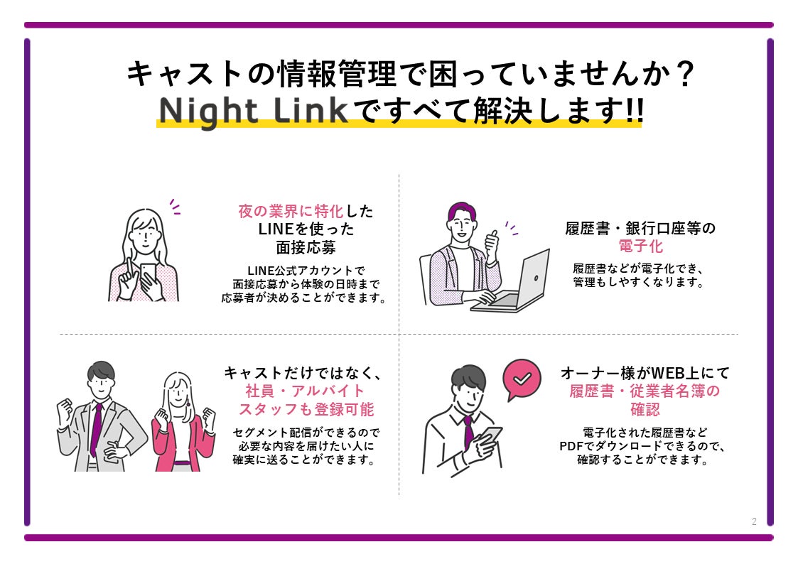 株式会社ブーケは、夜職業界に特化した面接応募・人材管理システム「ナイトリンク(NIGHT LINK)」を、LINE公式アカウントを活用したSaaSツールとして正式リリース致します。