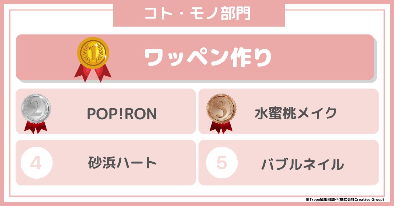 1位に選ばれたのは「ワッペン作り」。ポーチやネームタグなどに好きなパーツを取り付けて作成するオリジナルワッペン作りが可愛いと話題に。特に、韓国の人気雑貨屋「object(オブジェクト)」が、日本初の実店舗として名古屋にオープンした「object nagoya store(オブジェクトナゴヤストア)」での「ワッペン作り」が注目されています。オリジナルワッペンに推しの名前を入れた「推し活」アイテムを作れる点でもZ世代からの支持を集めています。
