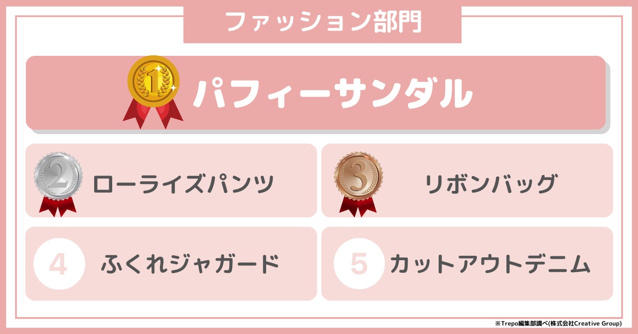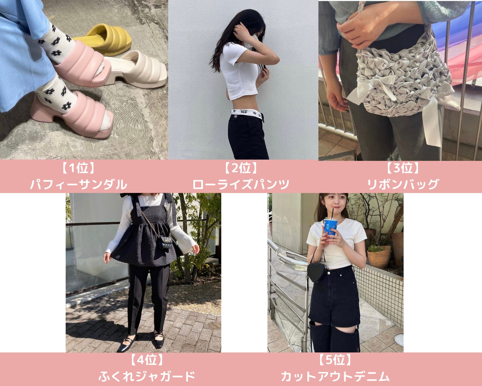 1位に選ばれたのは「パフィーサンダル」。ぷくぷくとした特徴的なデザインのサンダルで、ボリューム感がコーデの主役になるとZ世代の間で人気が急上昇しています。また、ソールがクッション性のため、足が疲れにくく履き心地が良いことも魅力のひとつ。スポーツサンダルやトングサンダル、ミュールサンダルなど様々なタイプがあり、どんなコーデにも相性良く使えるファンションアイテムです。