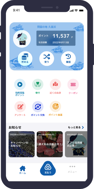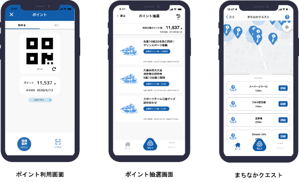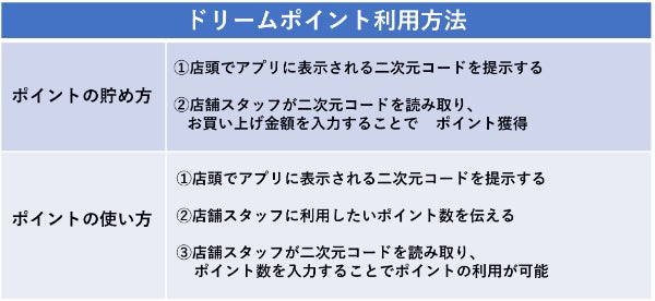 「ドリームポイント」は、2016年3月から久里浜商店会協同組合が実施しており、加盟店での買い物や指定する事業(イベント)への参加など、普段の暮らしを通じてポイントを獲得することができるほか、1ポイント=1円として、加盟店での使用が可能です。この度リリースした「ドリームポイントアプリ」では、二次元コードを読み取ることでポイントを貯める・利用することができるようになりました。さらに、ポイント交換、お知らせ配信やアンケートなど、アプリならではの機能が搭載され、より便利にお使いいただくことができます。
