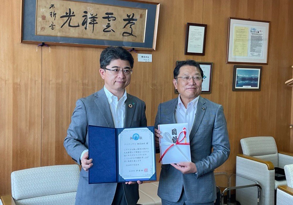 2022年7月22日、寄付先である長野県駒ヶ根市役所にて贈呈式を行い、社長の青山より目録をお贈りしております。(以下、贈呈式の様子/右:駒ヶ根市長 伊藤祐三様 左:当社代表取締役社長 青山英生)