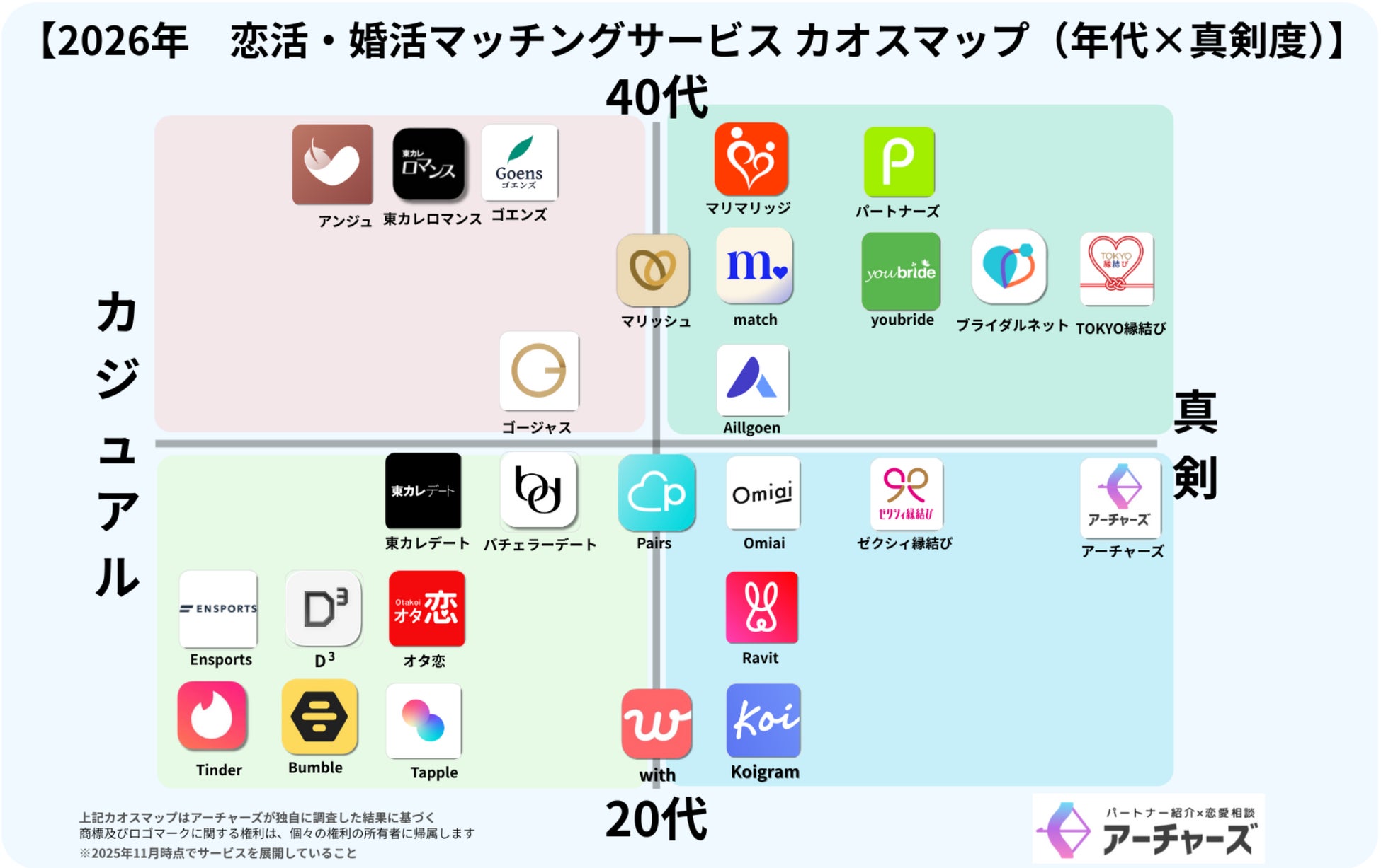 マッチングのプロが伴走支援する紹介型マッチングサービス『アーチャーズ』を運営するArchers株式会社(本社:東京都千代田区、代表取締役:杉江 綾希子、URL:https://www.90.archers.at/)は、2026年度最新版となる恋活・婚活マッチングアプリ『カオスマップ』を公開しました。