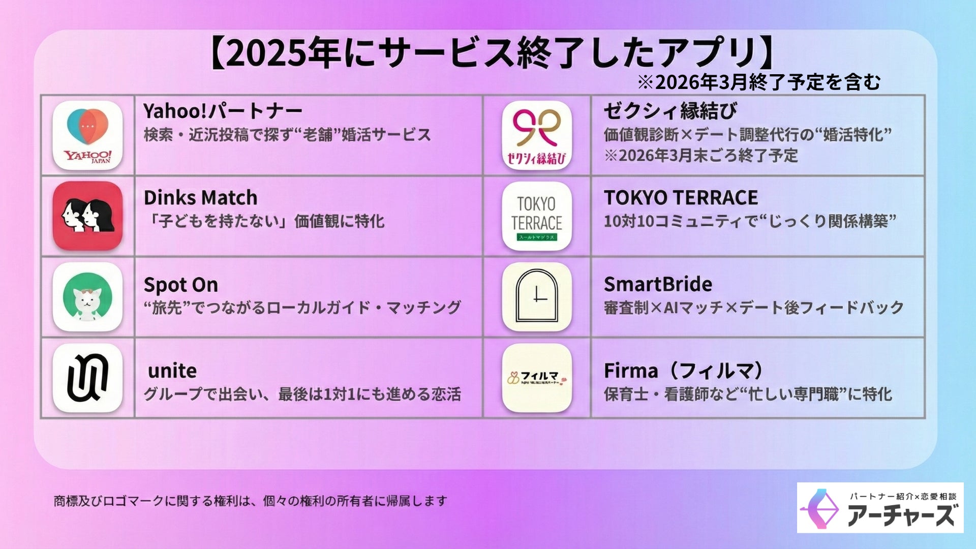 結果として、ユーザーの行動様式が変化し、新しいユーザー体験を提供するサービスへと市場の関心がシフトし、これらの終了事例は、単なる事業判断にとどまらず、「ユーザーが主導する探索プロセス」から「サービスが提案する確度の高い出会い」へと、マッチングアプリの価値提供の形が大きく変化しているという業界全体の潮流を象徴していると言えます。