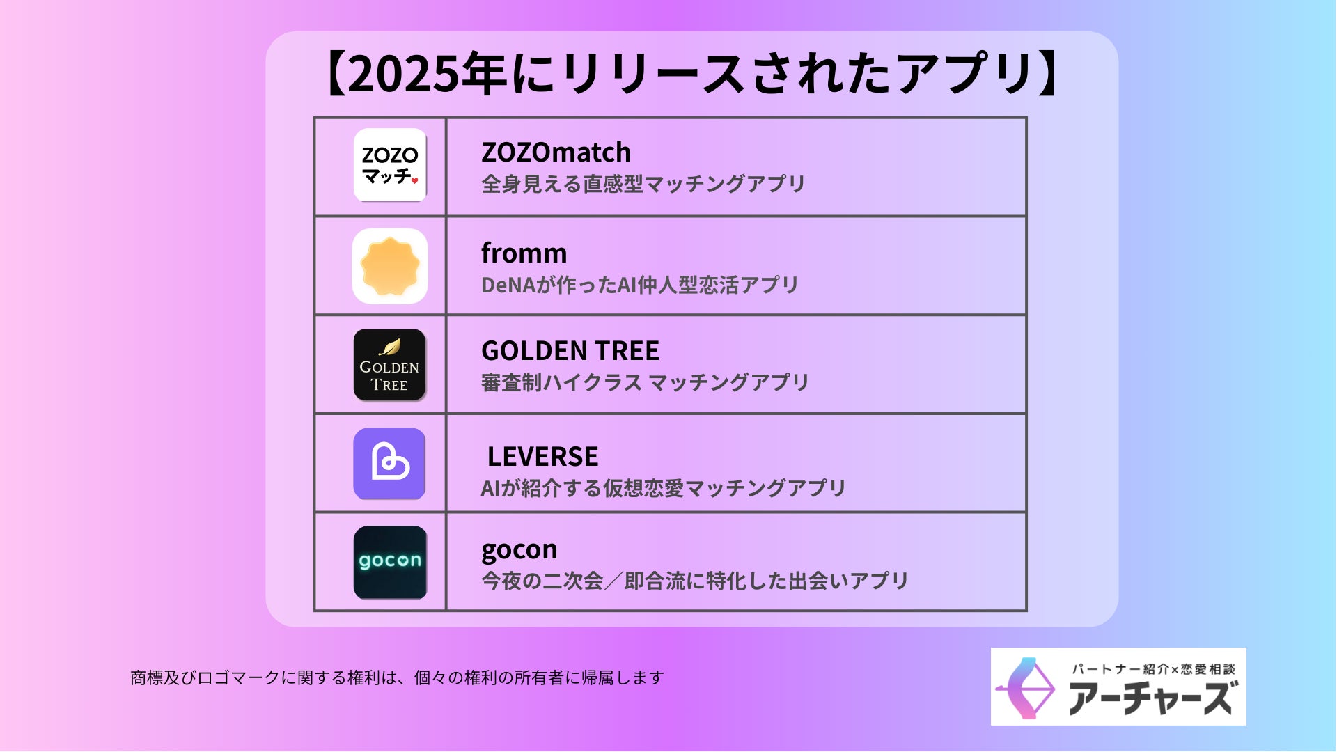 2025年には、従来の検索やメッセージの効率化に留まらず、AIを用いてより深いレベルでの相性を見極めたり、出会いの機会を再設計したりする「別の視点」からのマッチングアプリが多数リリースされています。