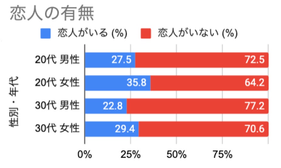 同調査によると、20代~30代の未婚男女における「現在恋人がいない」割合は極めて高い水準にあります。特に20代男性では72.5%、20代女性でも64.2%に恋人がおらず、若者の過半数がフリーの状態です。 さらに特筆すべきは、20代男性の約半数(46.0%)が「交際経験自体がない」という事実であり、恋愛の初期段階でつまずいている層が一定数存在することが分かります。