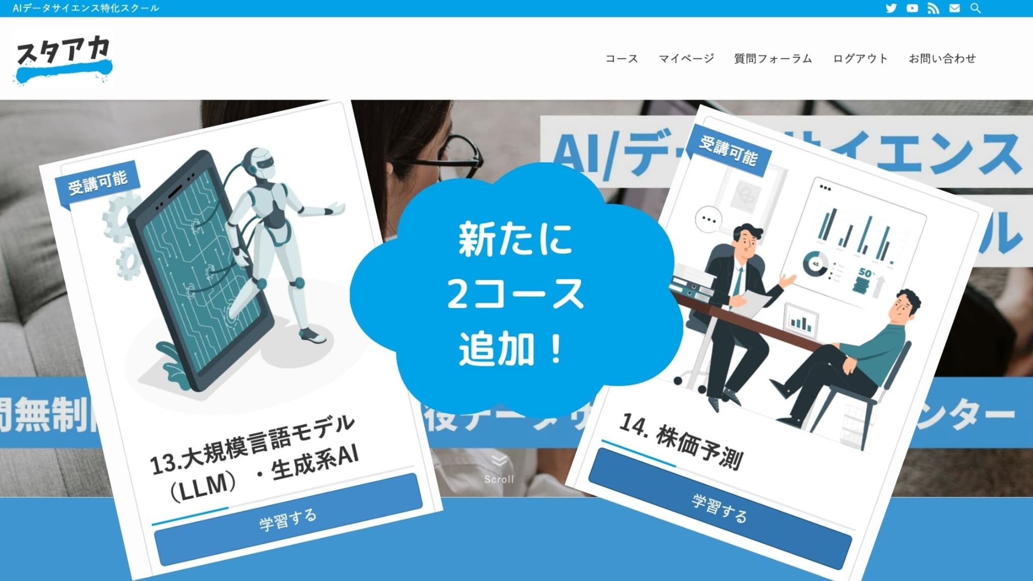 AIデータサイエンス専門スクール「スタアカ(スタビジアカデミー)」に「大規模言語モデル(LLM)・生成系AIコース」と「株価予測コース」が追加!予測精度を競う企画を実施!