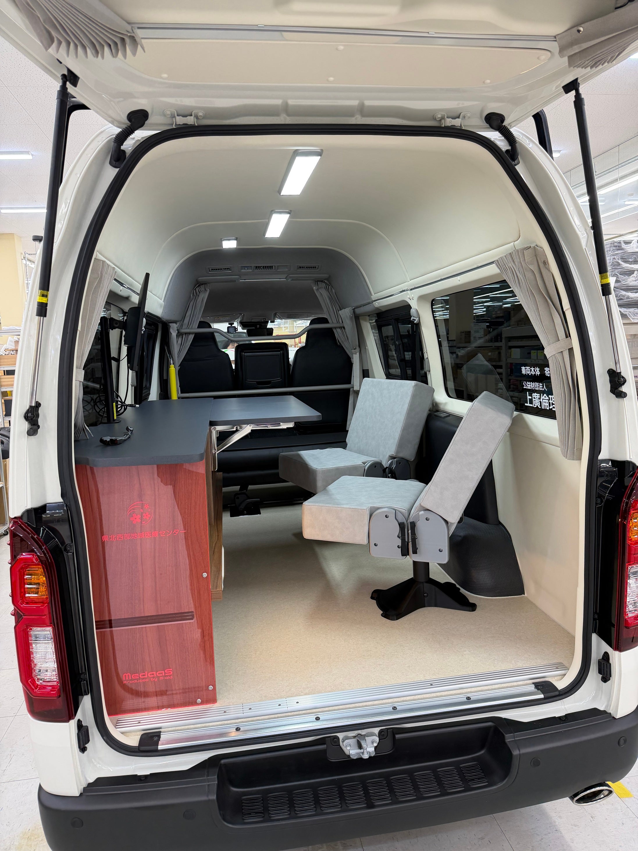 このような背景から、郡上市国保白鳥病院様と株式会社M-aidは連携し、地域の実情に即した医療MaaS車両の導入を進めてまいりました。本車両はトヨタ ハイエース(標準ナローハイルーフ・4WDディーゼル)をベースとし、看護師一人でも安心して運転できるコンパクトなボディサイズでありながら、スタッフと患者様を含む最大6名が乗車できる室内空間を確保しています。