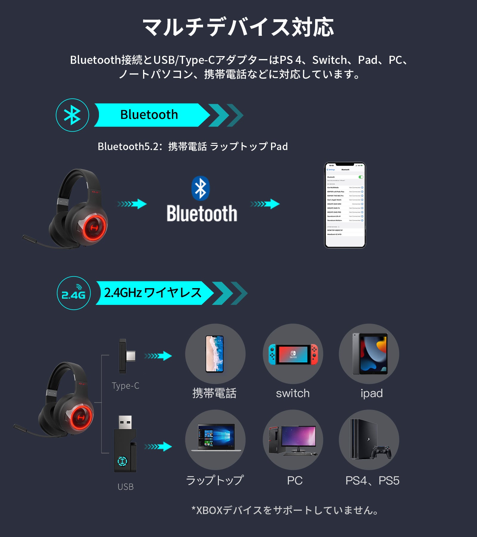 Bluetoothのほか、USB/Type-Cアダプターにも対応しており、PS 4、Switch、各種タブレット、パソコン、スマートフォンなどでの使用が可能です。