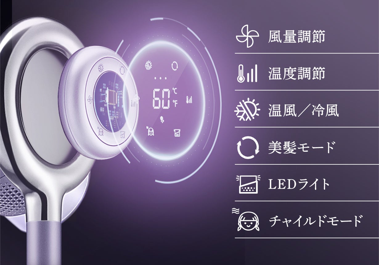 新たに搭載された『チャイルドモード』は風量「中」、温度レベル「50」の熱すぎない温風で、お子様にも安心してお使いいただけます。