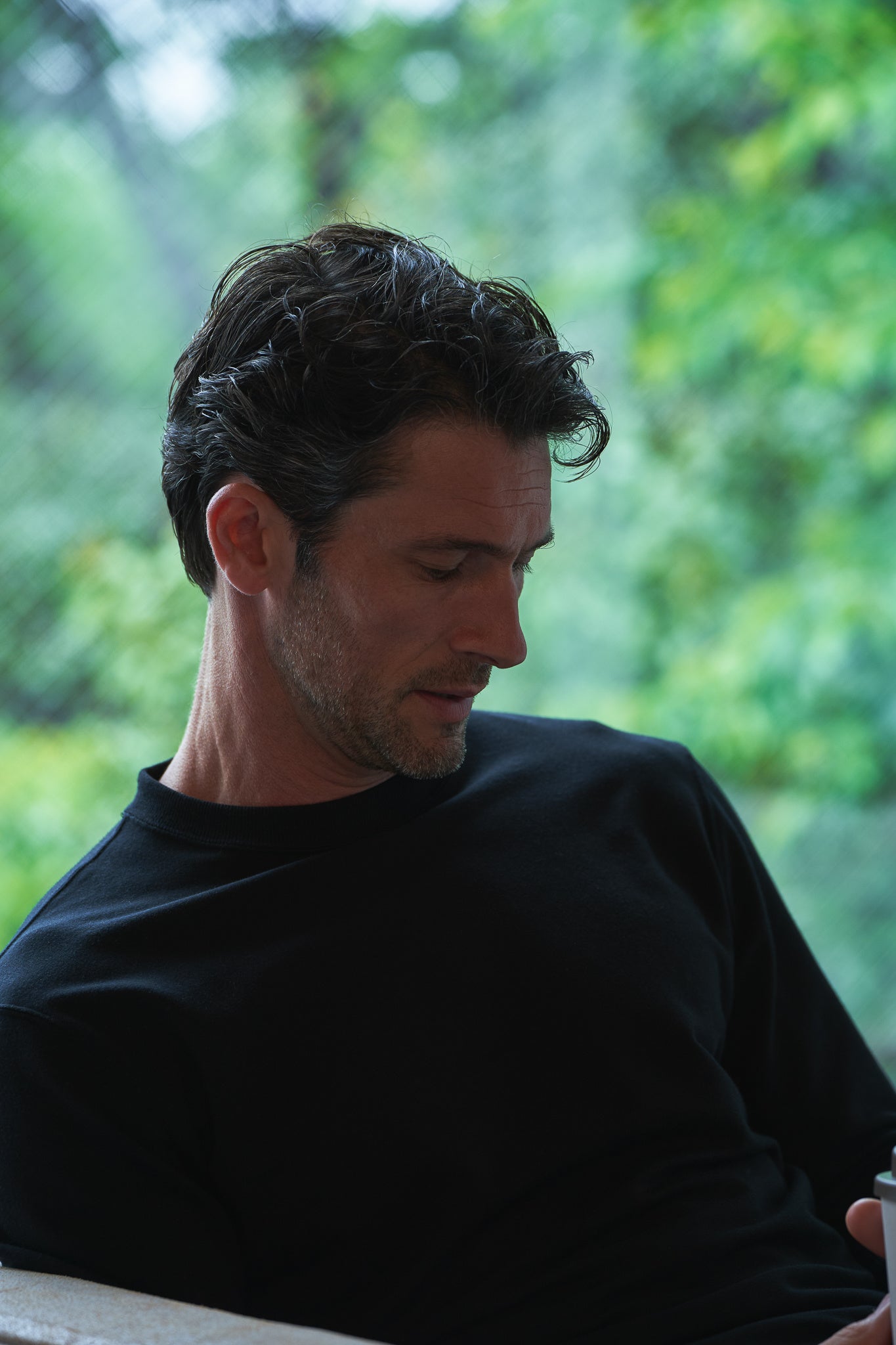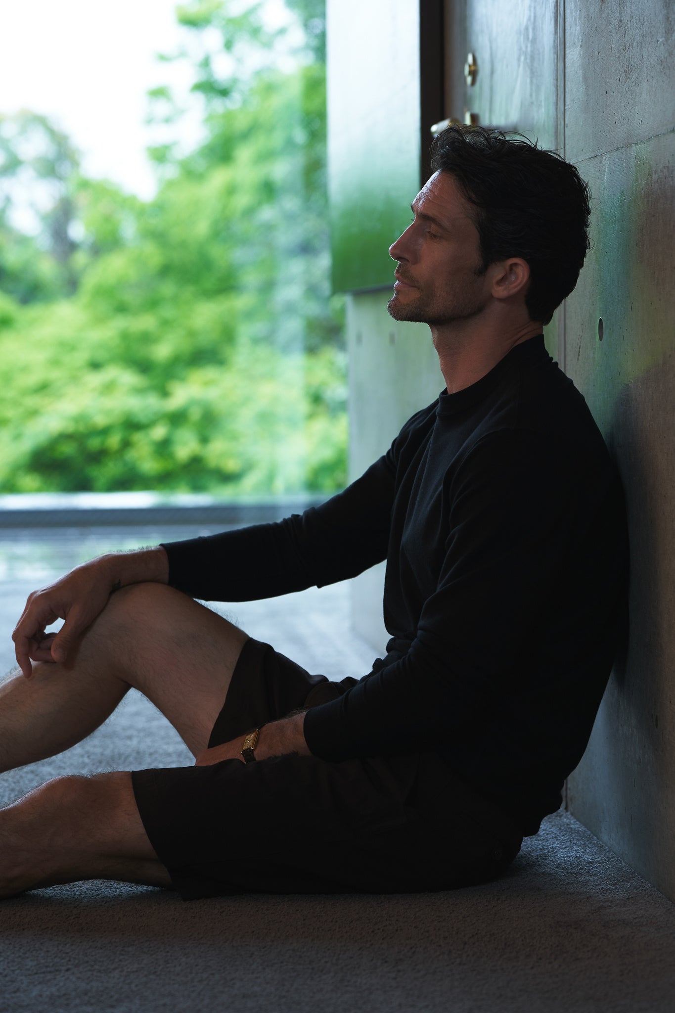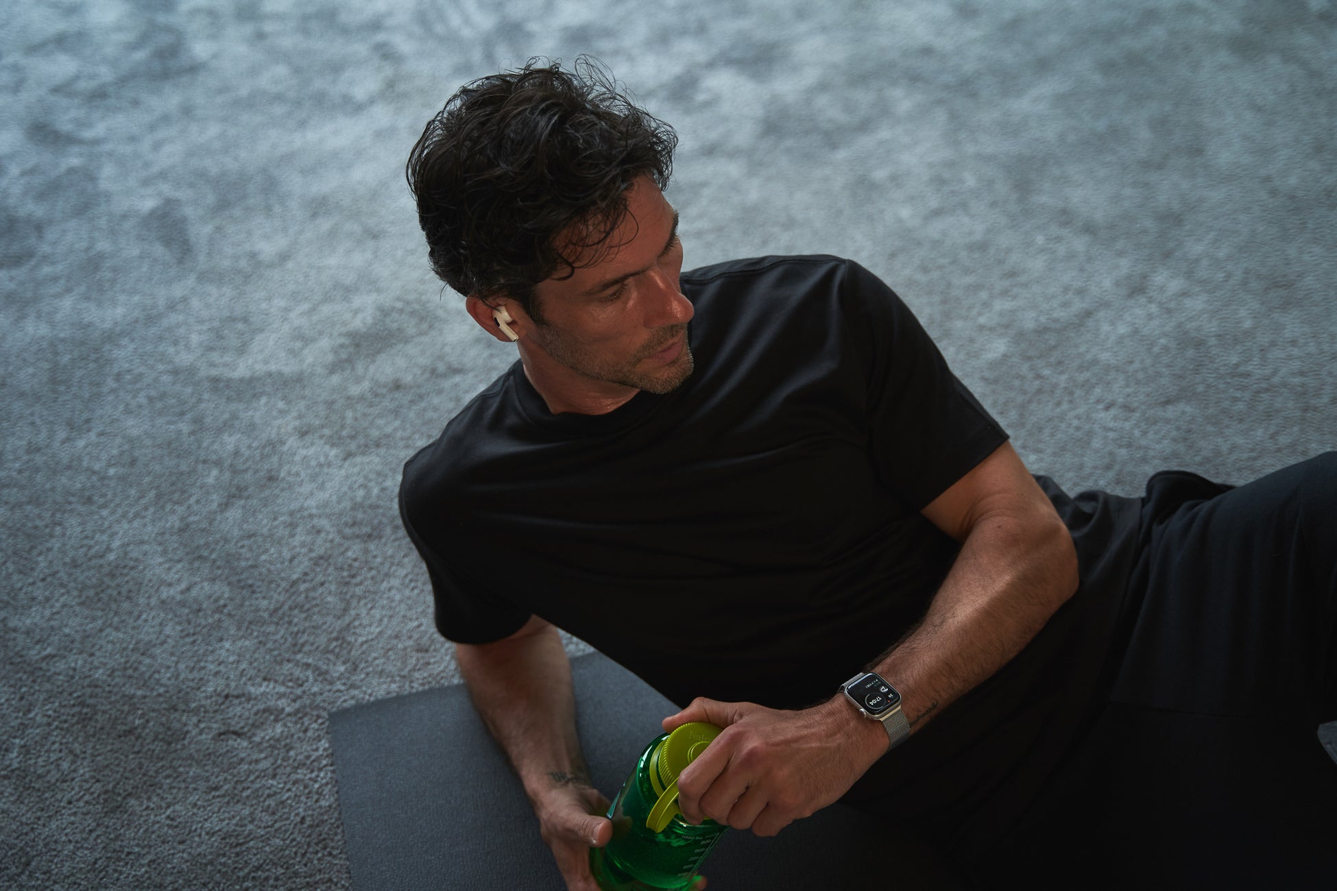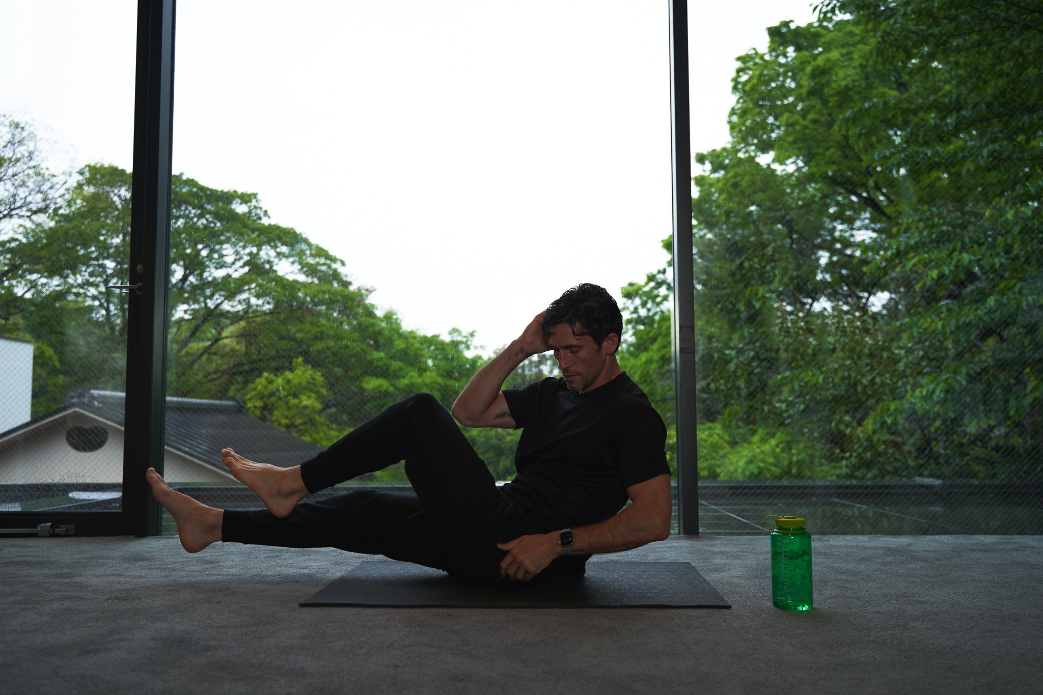[フィットネスウェア]仕事の集中力が切れたタイミングなど、脳疲労をリフレッシュするためにワークアウトは重要。汗をかいても気にならず、程よいストレッチ性のある「三刀流Tシャツ - Black」と縫製による工夫でポケットの中身がおちにくい「リヨセル オーガニックコットン ジョガーパンツ - Black」でワークアウト