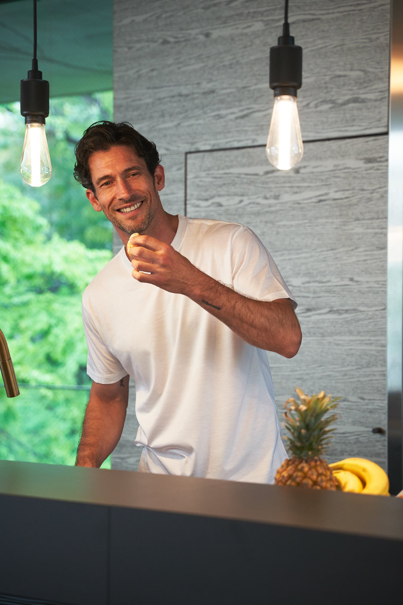 [ルームウェア] 植物性由来でシルクのような肌触りで快適ながらも一枚でキマる「三刀流Tシャツ - White」で過ごす朝のひととき