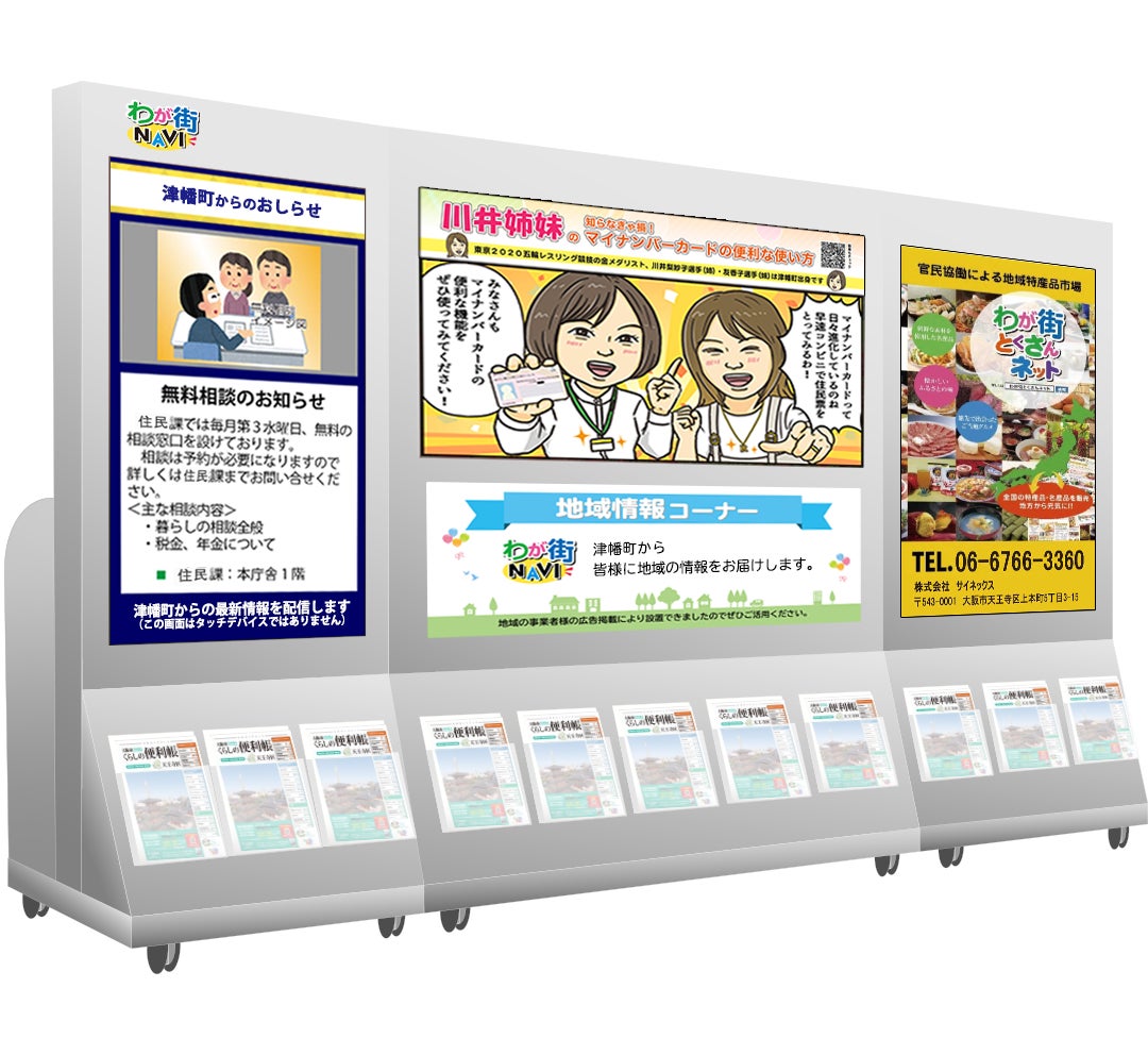 サイネックスと行政の官民協働により、日常生活で利用する利便性の高い情報と共に、行政情報や地域情報を動画などで発信する大型デジタルサイネージです。これまで全国のイオン100店舗ほか商業施設・道の駅、自治体庁舎等に設置しています。