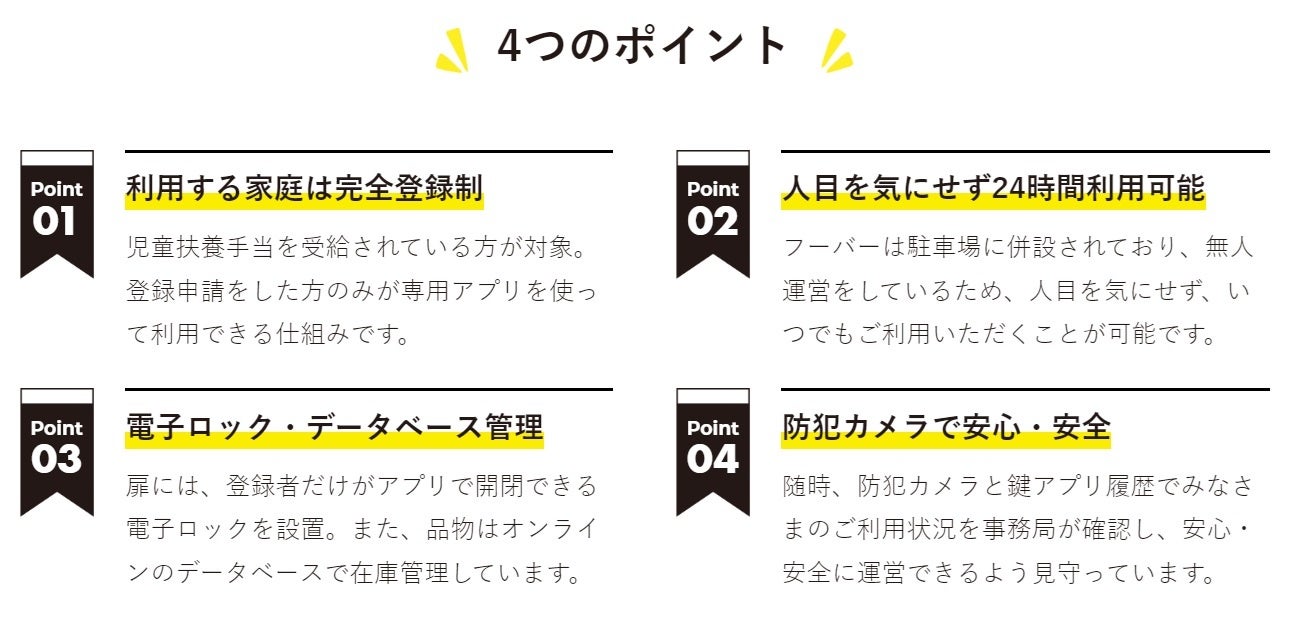 児童扶養手当を受給しているひとり親世帯(現時点では、大町町町民に限る)を対象とし、フーバーに保管されているフードプレゼンターから提供いただいた寄付品(食料・日用品)を無料で持ち帰ることができます。8月28日に「FOOBOUR -おおまち港-」を開始します。