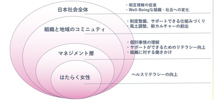 少子高齢化に向かう今の日本。 多様性を認め、女性だけでなくすべての人が自分らしく活躍できるようにしていくことが必要です。特に地域こそ女性の力を活かしていく発想が必要で、多くの自治体が女性のキャリアアップ、男女共同参画を推進していますが、「女性の健康課題」の改善を図ることでより質の高い男女共同参画社会を目指す事に繋がり、持続可能な地域社会につながると考えられます。