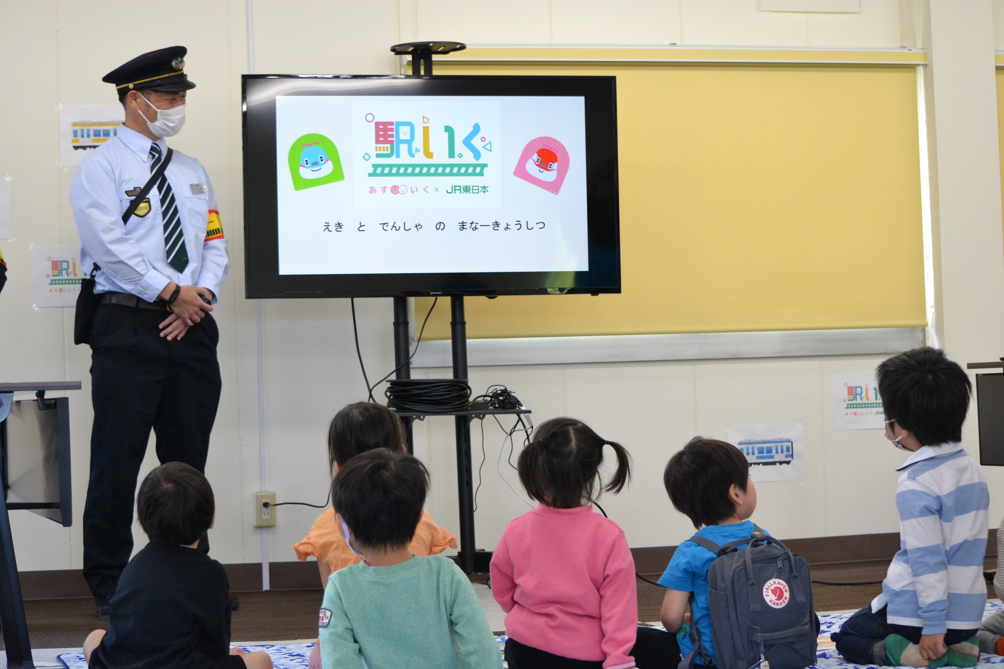 ①駅に設けた保育スペースで駅⻑さんにご挨拶!