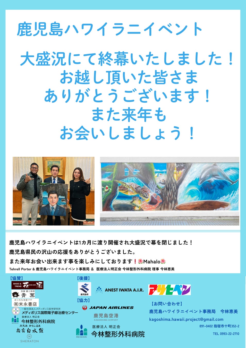 「この度は、『鹿児島ハワイラニイベント』に多大なるご支援、ご協力を賜り、誠にありがとうございました。Tehrell Porter氏の素晴らしいアートと温かい人柄に触れ、鹿児島の皆様とハワイの文化が繋がる貴重な機会となりました。特に、子どもたちがアートを通じて笑顔になる姿や、地域の方々が一体となってイベントを盛り上げてくださったことに深く感謝しております。本イベントが、鹿児島県の観光振興および国際交流の一助となれば幸いです。ご来場いただいた皆様、ご協力いただいた関係各位に心より御礼申し上げます。」