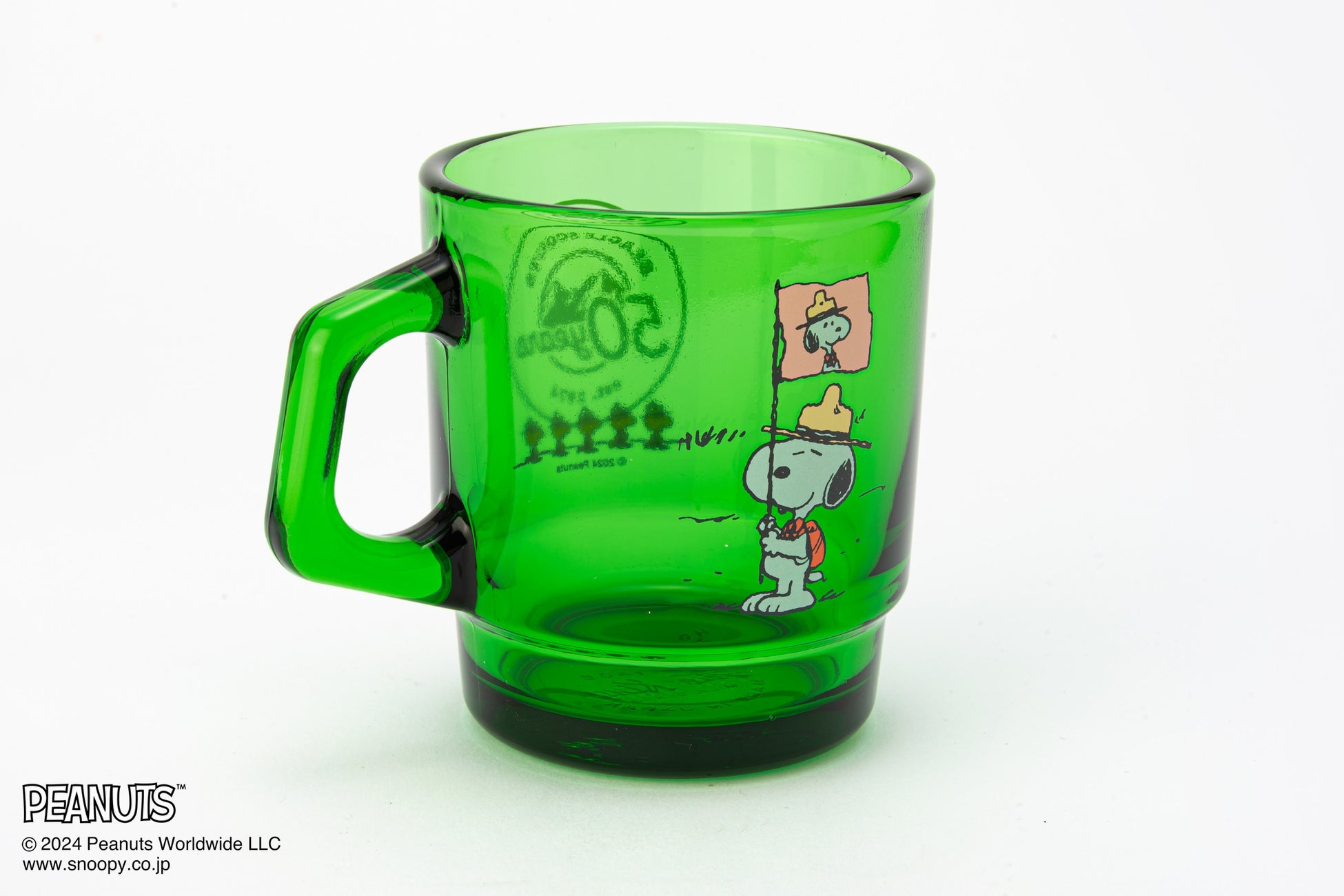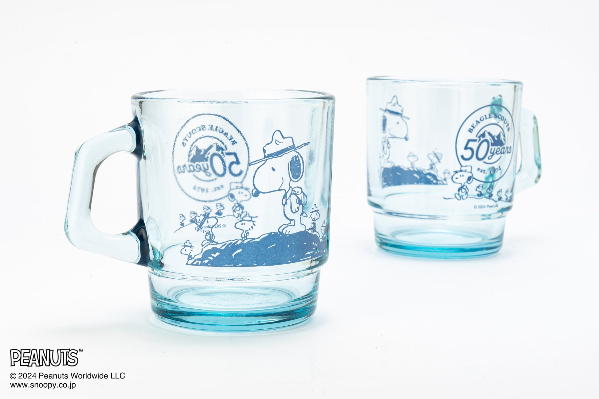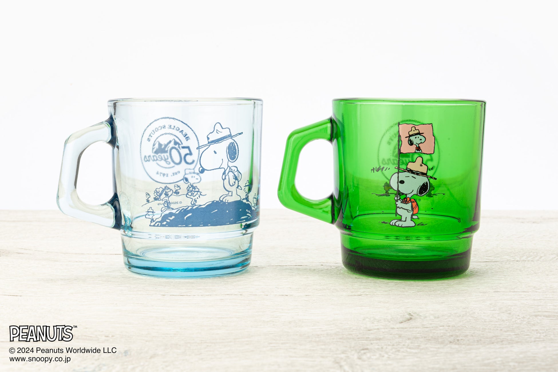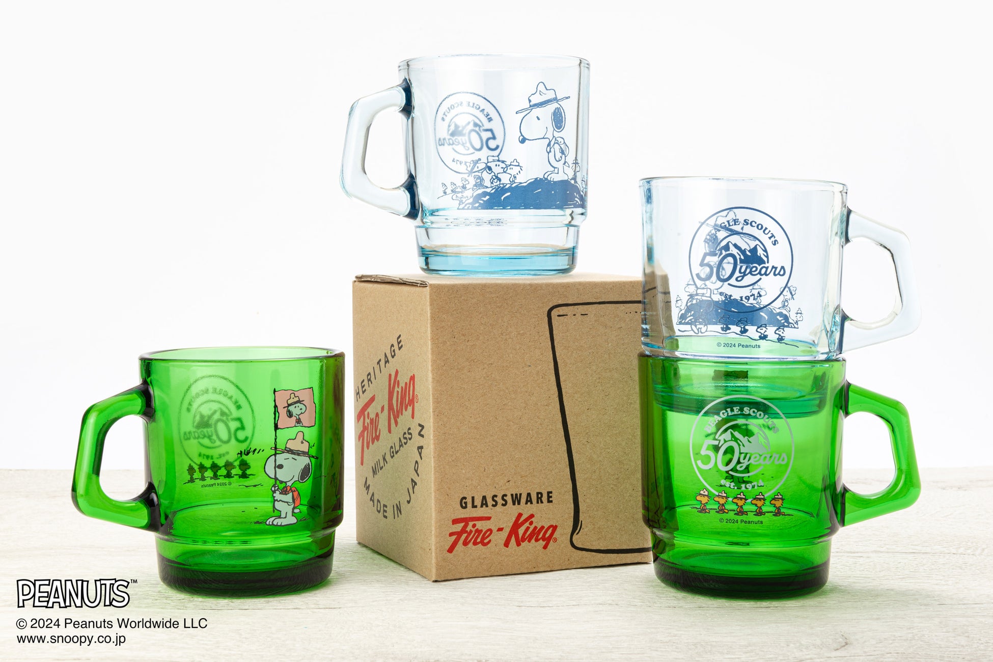 このたび Fire-King ピーナッツシリーズより、スヌーピーがリーダーをつとめる「ビーグル・スカウト」をデザインした、ビーグル・スカウト50周年記念となる2つのスタッキングマグが登場です。
