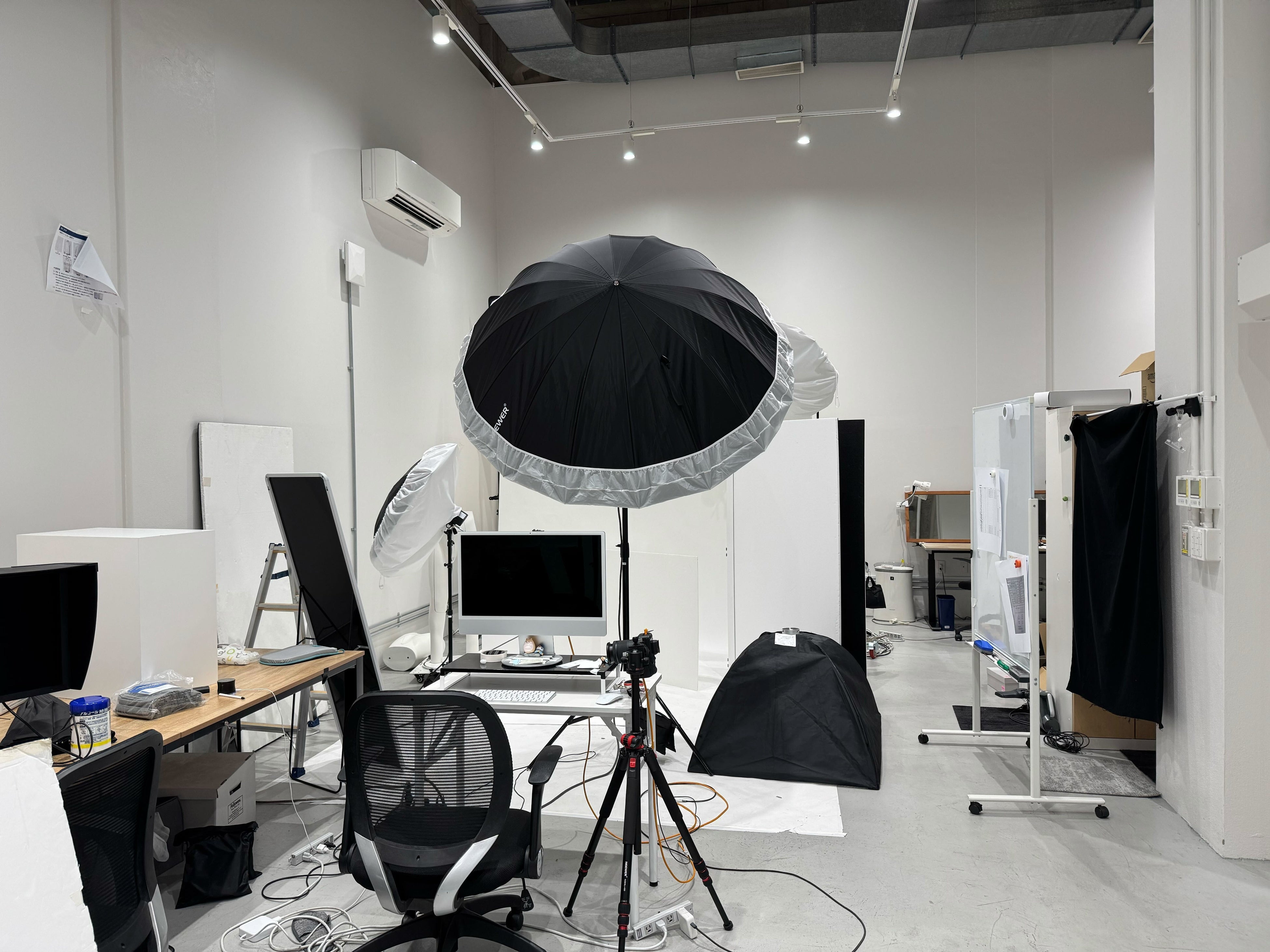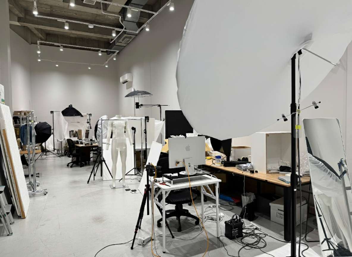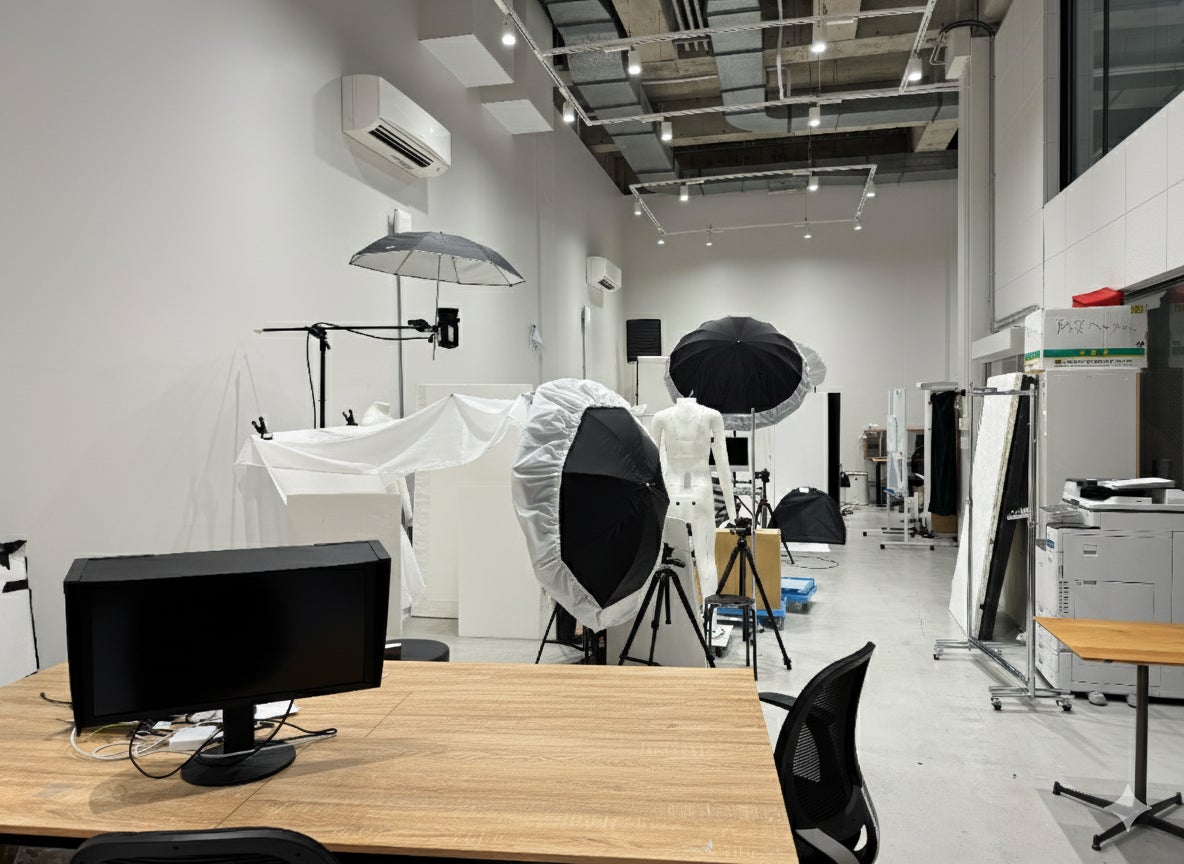 新設された富ヶ谷スタジオは、天井高が6mあるオフィス地下1階の約110㎡のスペースを活用し、モデル撮影用のブースに加えて、吊り撮影用レーン1つ、物撮り用レーン2つを完備しています。これにより、アパレル商材のモデル着用カットから、ハンガーにかけた状態での吊り撮影、商品単体の物撮りまで、多様な撮影ニーズに柔軟に対応することが可能です。