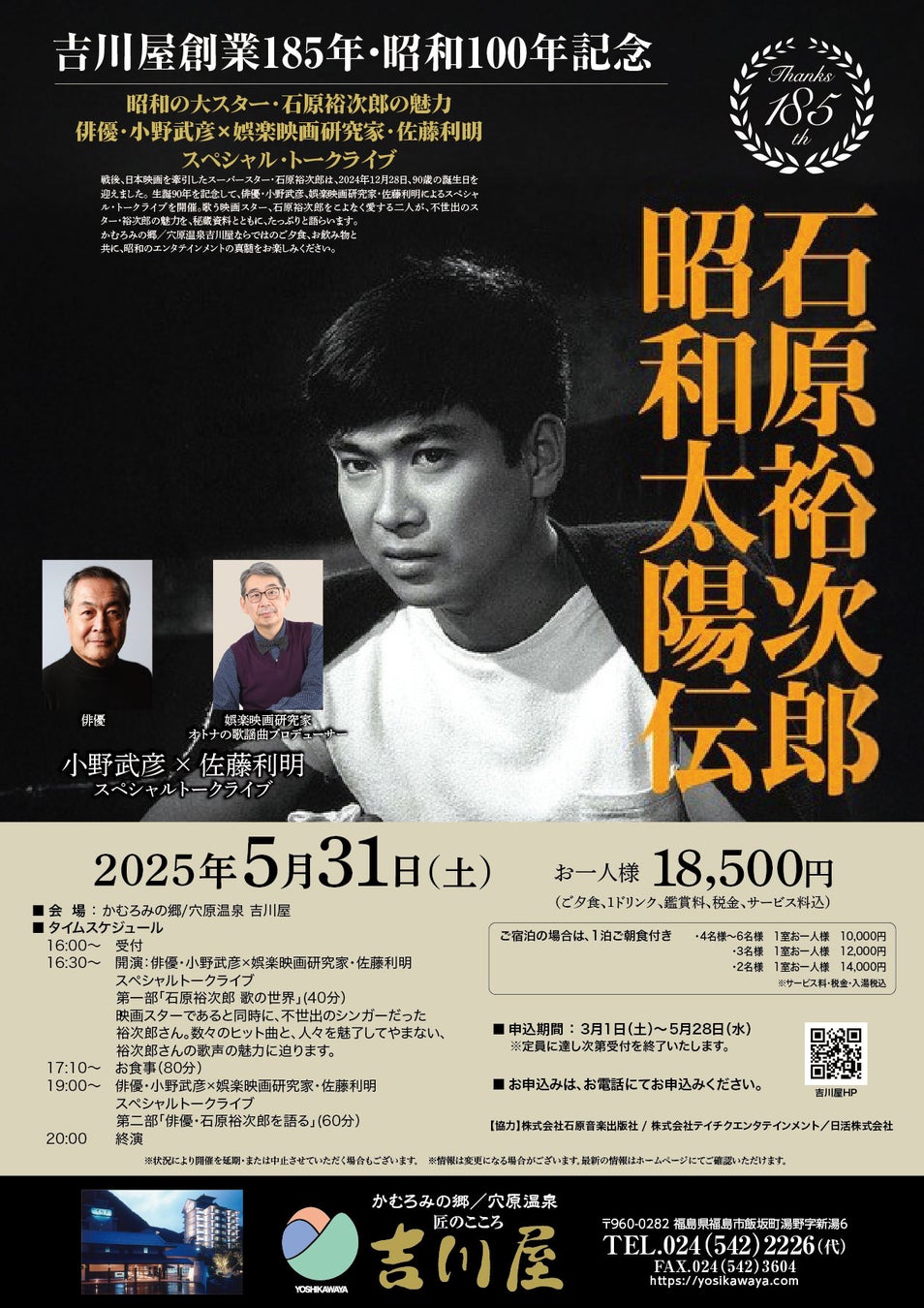 2024年12月28日に生誕90年迎えた歌う映画スター、石原裕次郎。不世出のスター・裕次郎をこよなく愛する二人が、185周年を迎える老舗旅館・吉川屋で、その魅力を秘蔵資料とともにたっぷりと語らいます。