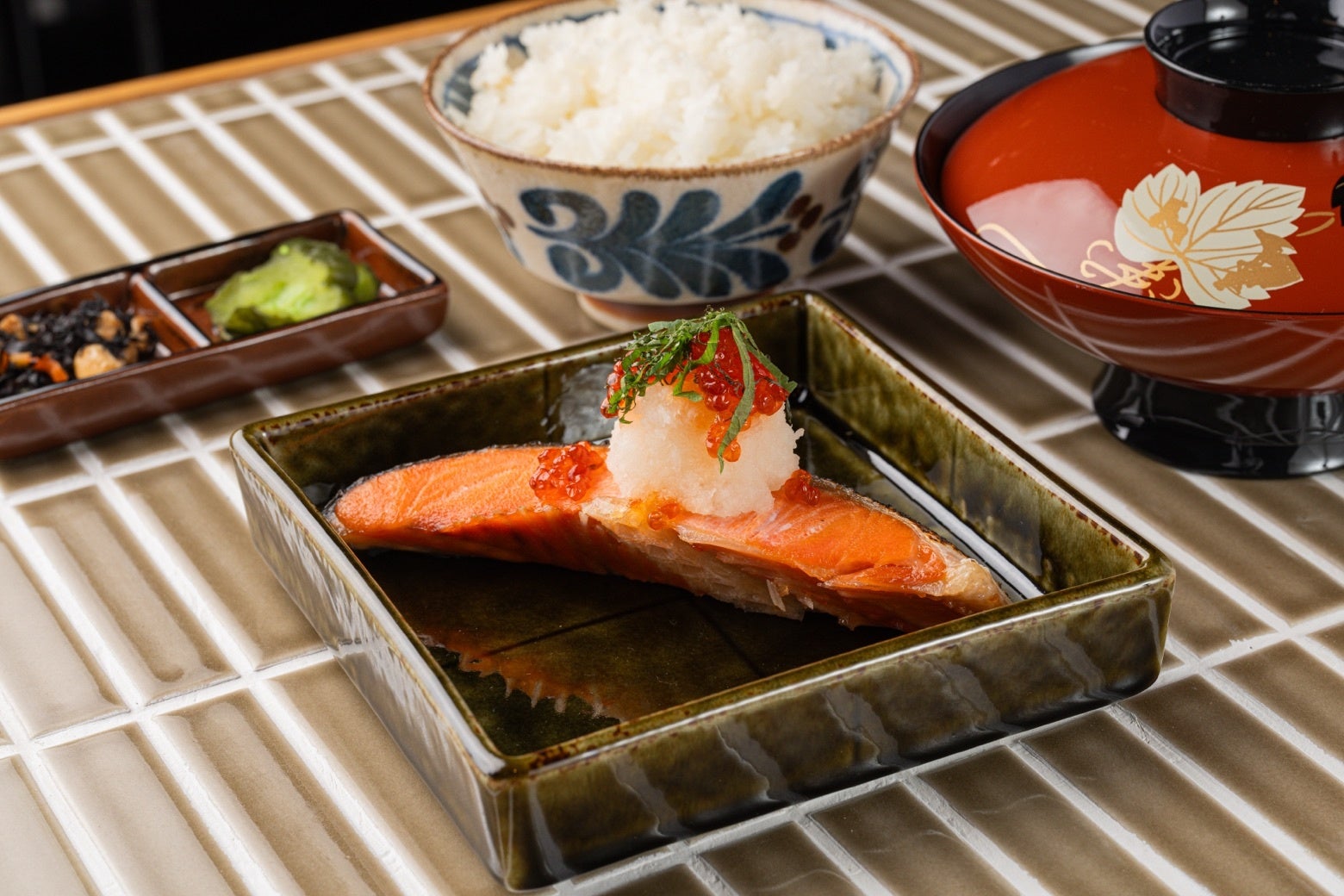 脂の乗った香ばしい銀鮭にいくらと大根おろしを添えた豪華な一皿。豊かな旨みをごはんとともにお楽しみください。