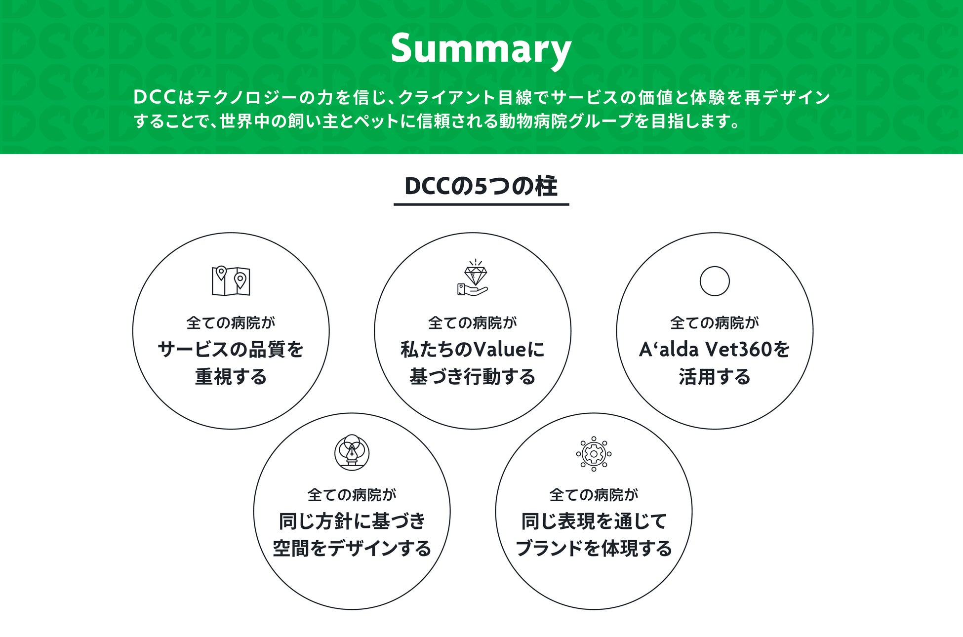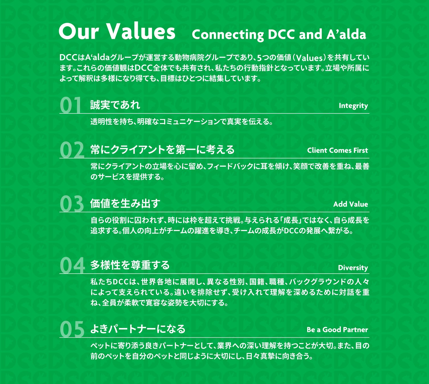 2023年6月5日に「株式会社ワンヘルスコーポレーションが運営する動物病院の名称変更に関するお知らせ」(https://aalda.com/ja/news/202306051917/) を発表いたしましたが、続報として、新たに展開する動物病院グループ「DCC動物病院(英語表記:DCC Animal Hospital)」が今後どのような動物病院グループを目指すのかを指し示す「DCC SPIRIT」及び新サービスロゴを公開したことをお知らせいたします。また、A'aldaグループ総院長である中村篤史から「DCC SPIRIT」に込めた想いとブランドに対する考え方をお伝えいたします。