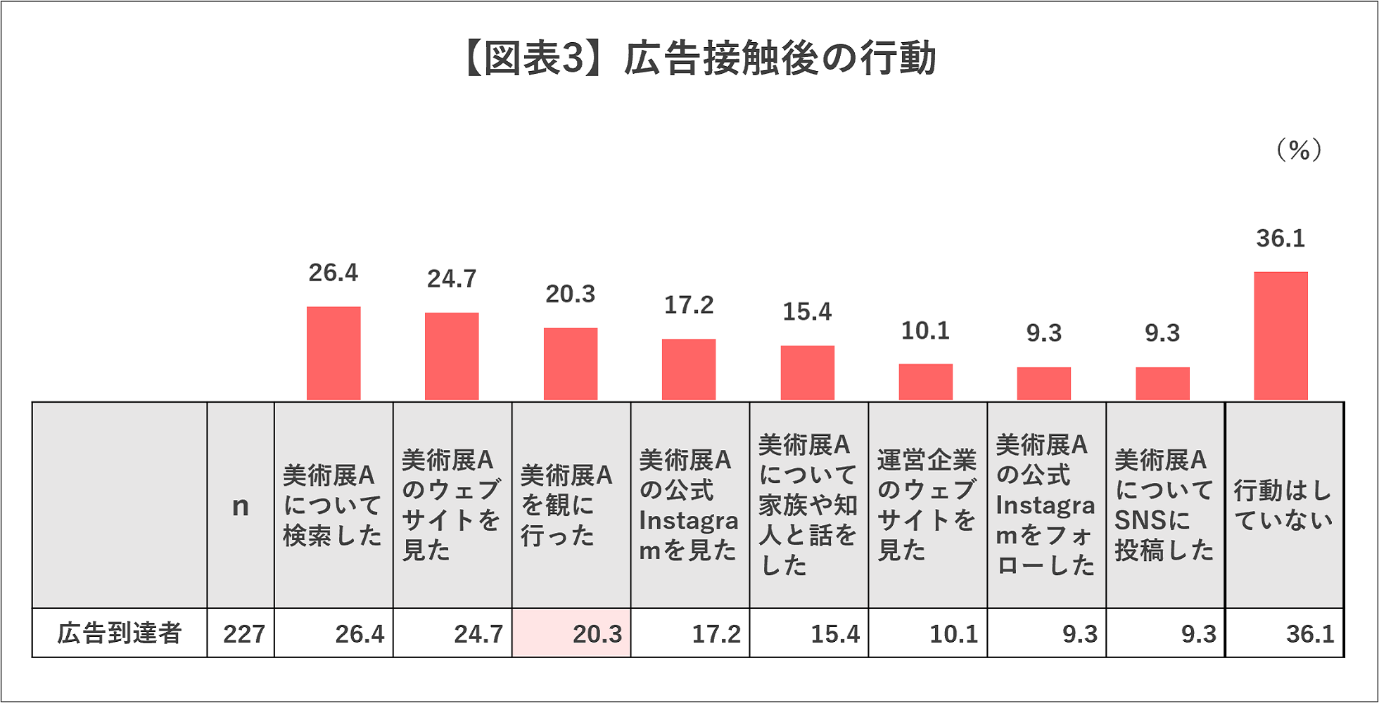 もう1つの効果として、行動喚起があります。広告到達者(n=227)における広告接触後の行動について確認すると、上位に挙がった行動は、「検索」「ウェブサイトへの訪問」でした。次点で、「美術展Aへの訪問」が挙がり、20.3%でした(図表3)。広告掲出が集客にも貢献したことが分かります。