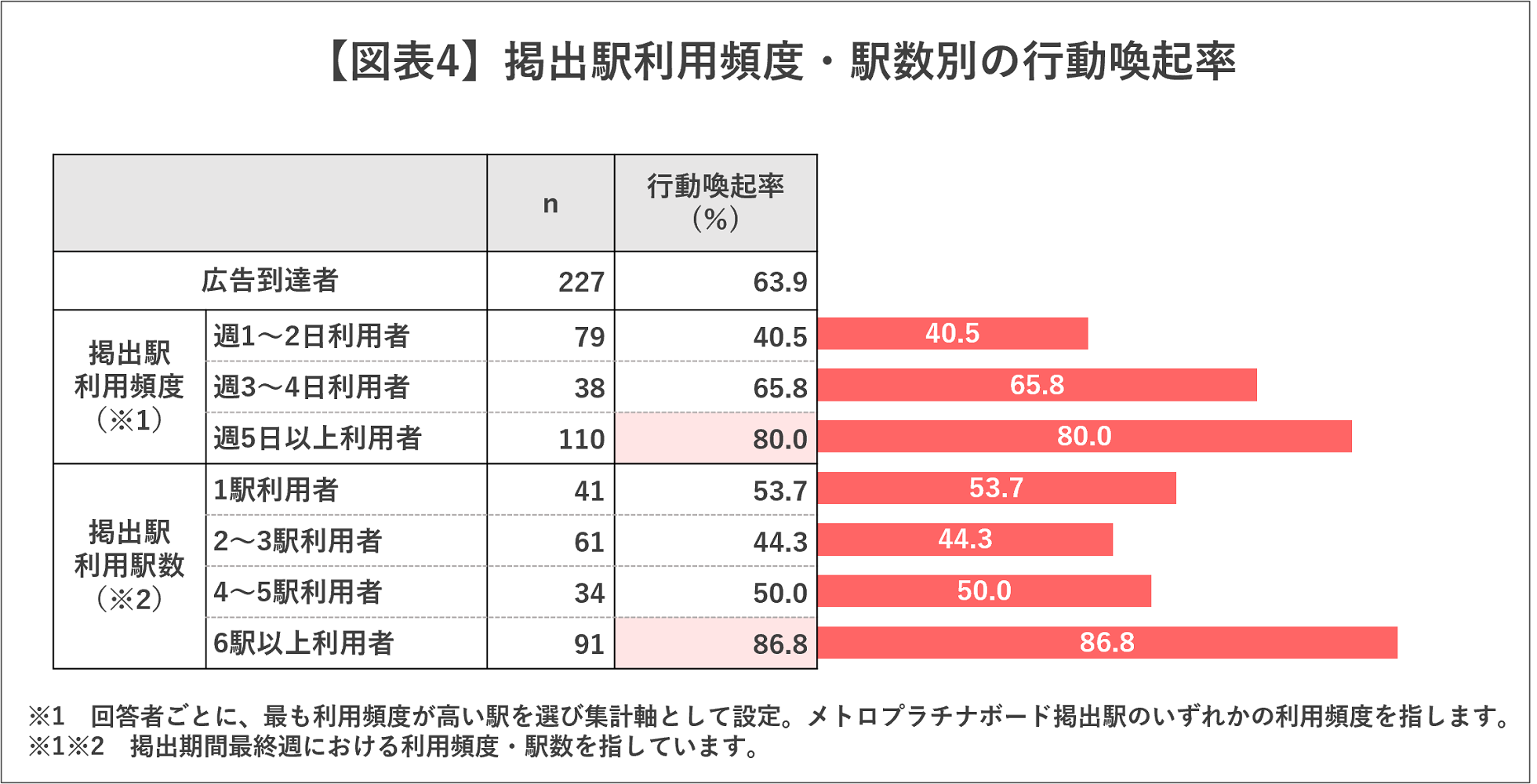 また、図表3内のいずれかの行動を取った割合を「行動喚起率」として集計すると、広告到達者全体では63.9%でした。また、掲出駅の利用頻度別・利用駅数別での行動喚起率は、週5日以上利用者では80.0%、6駅以上利用者では86.8%と、いずれも8割越えの顕著な結果が見られました(図表4)!このようにアクティブな移動者に対し、広告を繰り返し接触させることは、行動喚起につながると言えそうです。