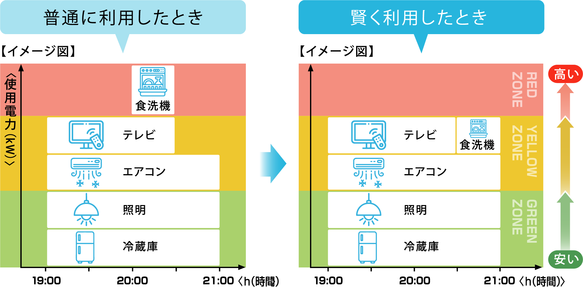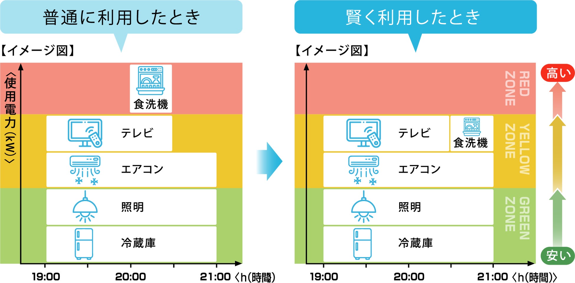 ・FNJ独自のデマンドレスポンス型電気料金プラン。30分単位の使用量に応じて料金単価を設定。家電の同時使用を抑える等、低い料金単価で収まるように使えば、電気料金の節約が可能。