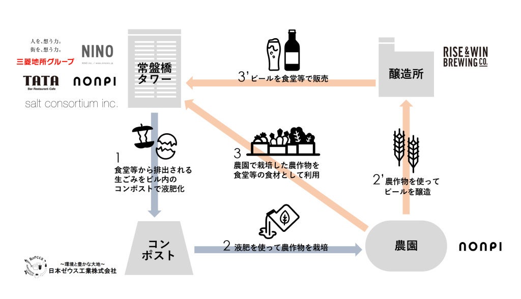 具体的には、常盤橋タワー(2021年竣工)内に設置したコンポストで施設から出る生ごみを液肥化し、近郊農地(ゼロ・ウェイスト社食を目指す株式会社ノンピ社の協力)でその液肥を活用した農作物を育て、収穫された農作物を常盤橋タワーや三菱地所の社食(株式会社ノンピ社運営の「SPARKLE(スパークル)」)で提供するなど、スペックがこれまで上勝町の取り組みを参考に実現してきたサステナブルな活動のノウハウを発展させ、三菱地所が抱える生ごみの課題に対して実現可能なソリューションを提案してきました。