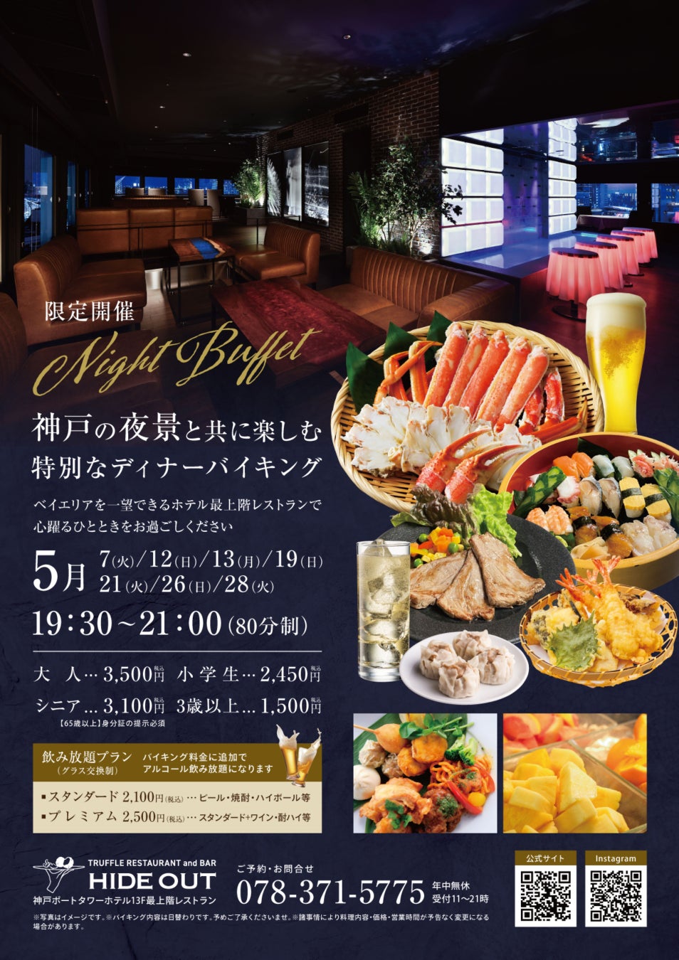 神戸ポートキッチンディナーを限定で神戸の夜景と共に楽しむ HIDE OUTでの特別なディナーバイキング限定開催!!