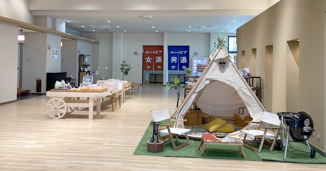 西予市の温浴施設、ユートピア宇和「游の里温泉」(愛媛県西予市明間6125番地)では、2021年の11月から12月にかけて館内入口付近のロビーを改装し、床材を全面フローリングに変更しました。この改装にあたり、施設全体のテーマを「キャンプ」に統一。ロビーにティピーテントを設営し、キャンプサイトの楽しい雰囲気を演出しています。