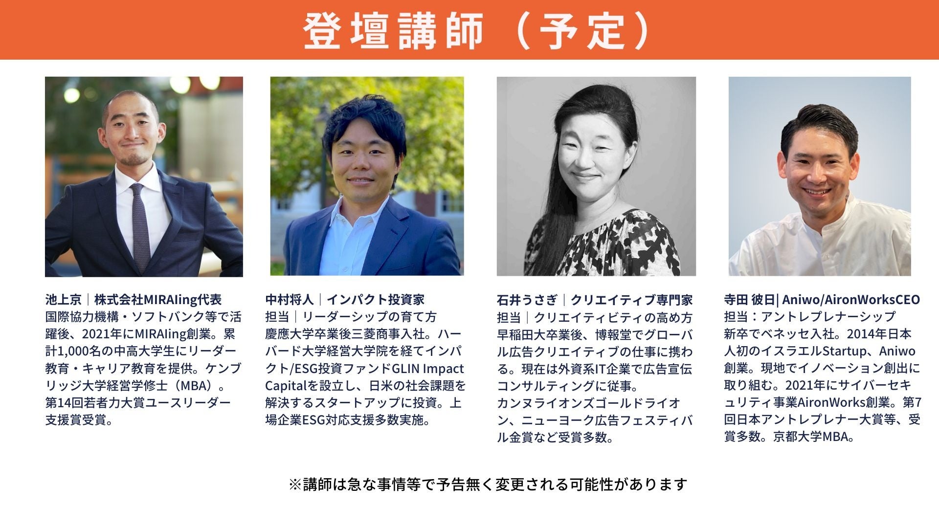 イスラエル・カンボジアで活躍する起業家、ハーバード出身投資家、上場スタートアップ執行役員等、最前線で活躍する社会人から最高の講義を受けながら、①コーディング無しのプロジェクト実装、②昆虫食商品企画・マーケティング、③21世紀に必要な教育事業立案に取り組む、学校で得がたい挑戦の機会です。
